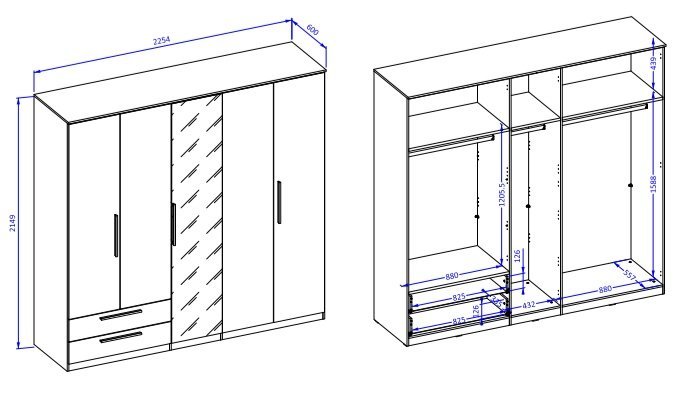 Der Kleiderschrank India S 2 ist die perfekte Wahl für alle, die eine funktionale und ästhetisch ansprechende Lösung für die Aufbewahrung suchen. Dank seiner Anpassungsfähigkeit an die Raumgröße und seinem modernen Look passt er zu verschiedenen Einrichtungsstilen, egal ob Schlafzimmer, Ankleidezimmer oder Flur.