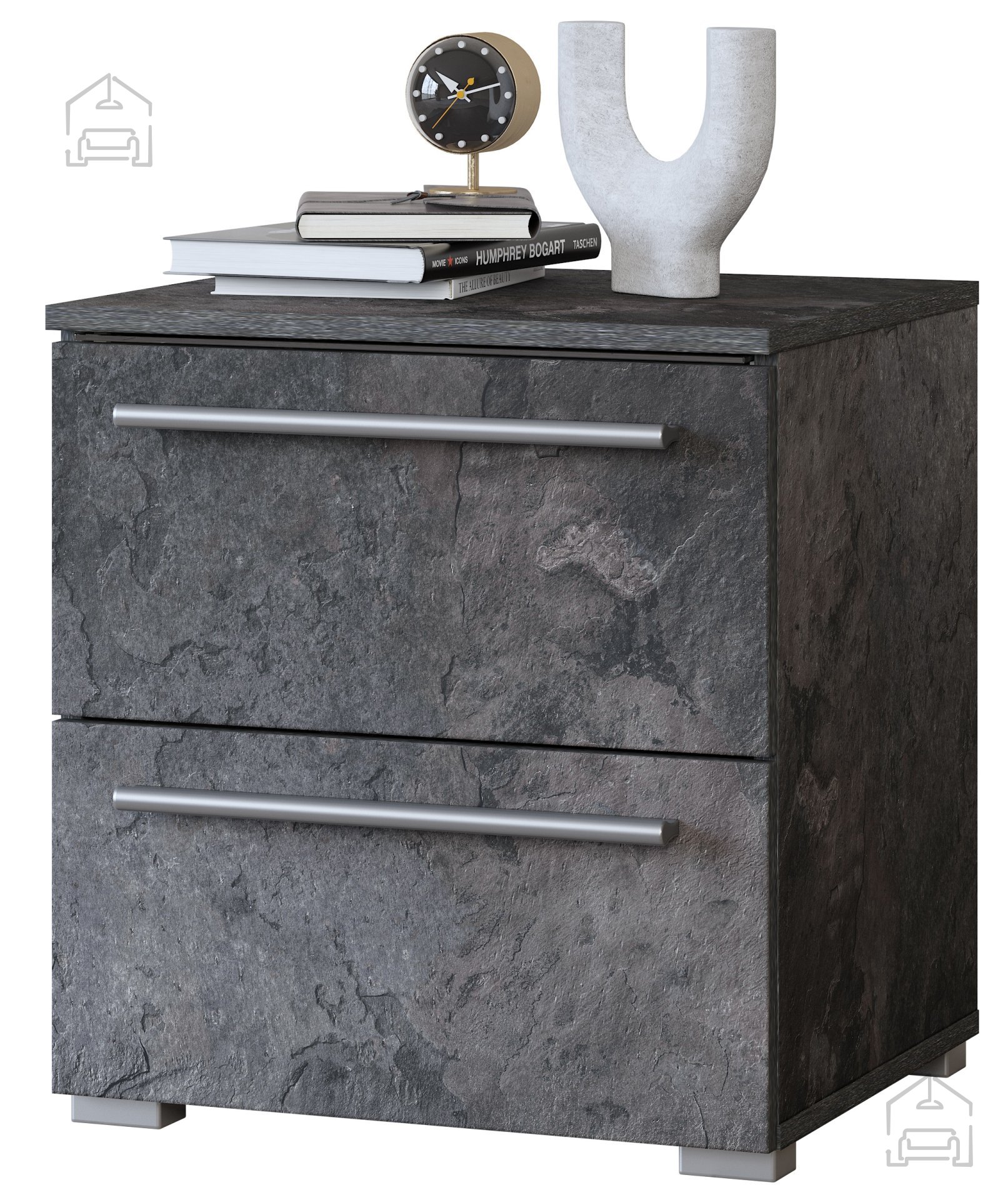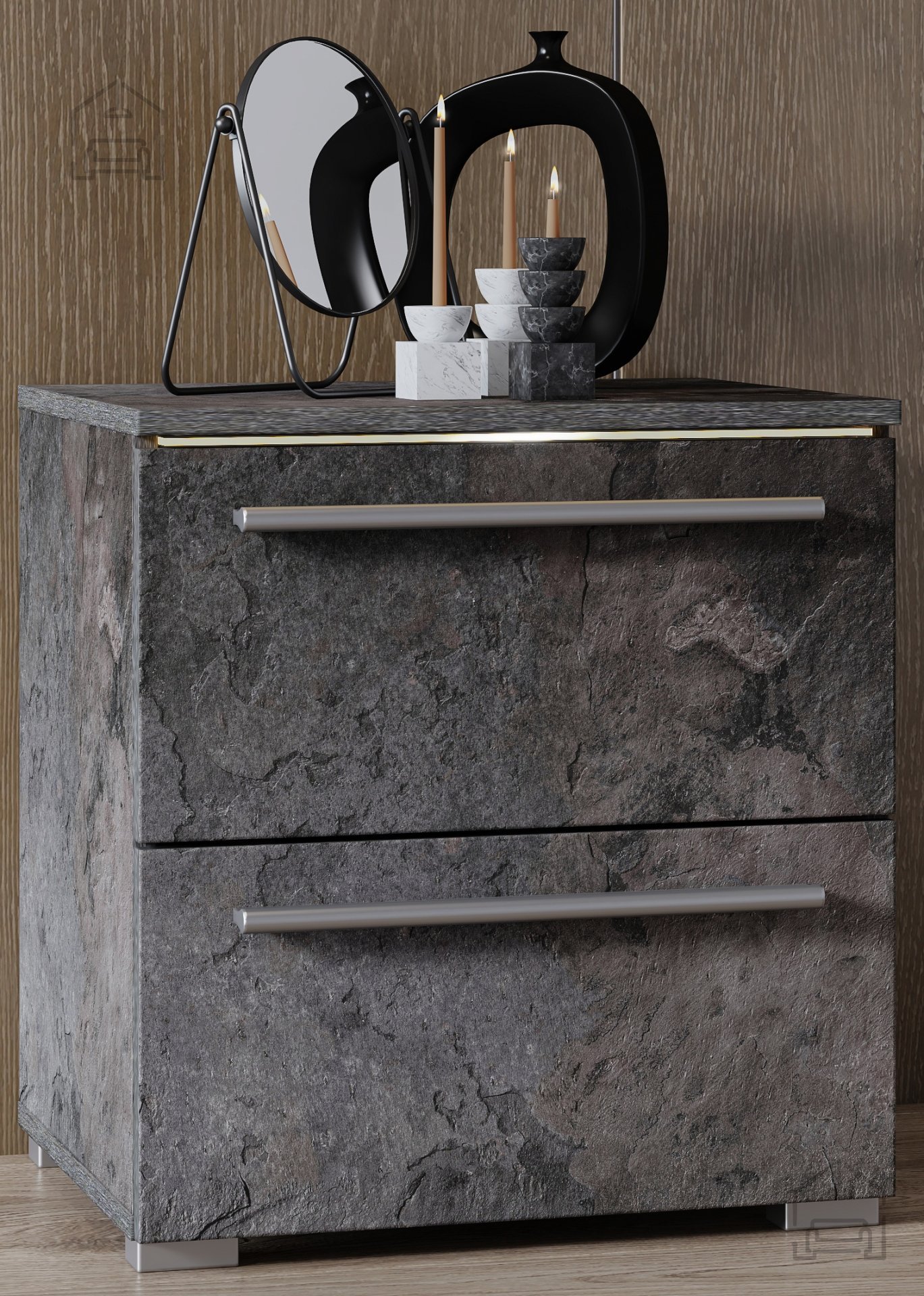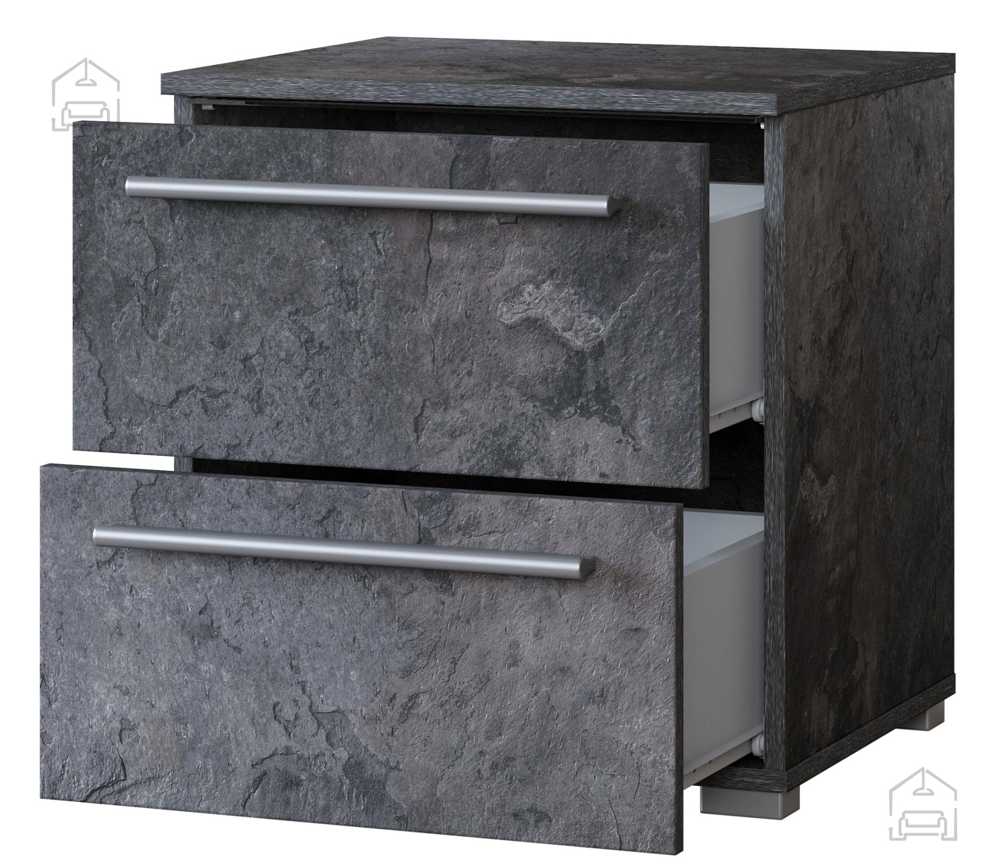 - Produktmaße: 46x50x41 cm - Material: Möbelplatte 15 mm - Rückwand: HDF-Platte 3 mm - Kanten: ABS-Kanten - Farbe: Schiefer Der Nachttisch India S besteht aus einer hochwertigen 15 mm starken Möbelplatte, die Stabilität und Langlebigkeit gewährleistet. Die Rückwand ist aus einer 3 mm starken HDF-Platte gefertigt, die zusätzliche Stabilität und Schutz bietet. ABS-Kanten sorgen für ein elegantes Erscheinungsbild und schützen den Nachttisch vor täglicher Abnutzung.