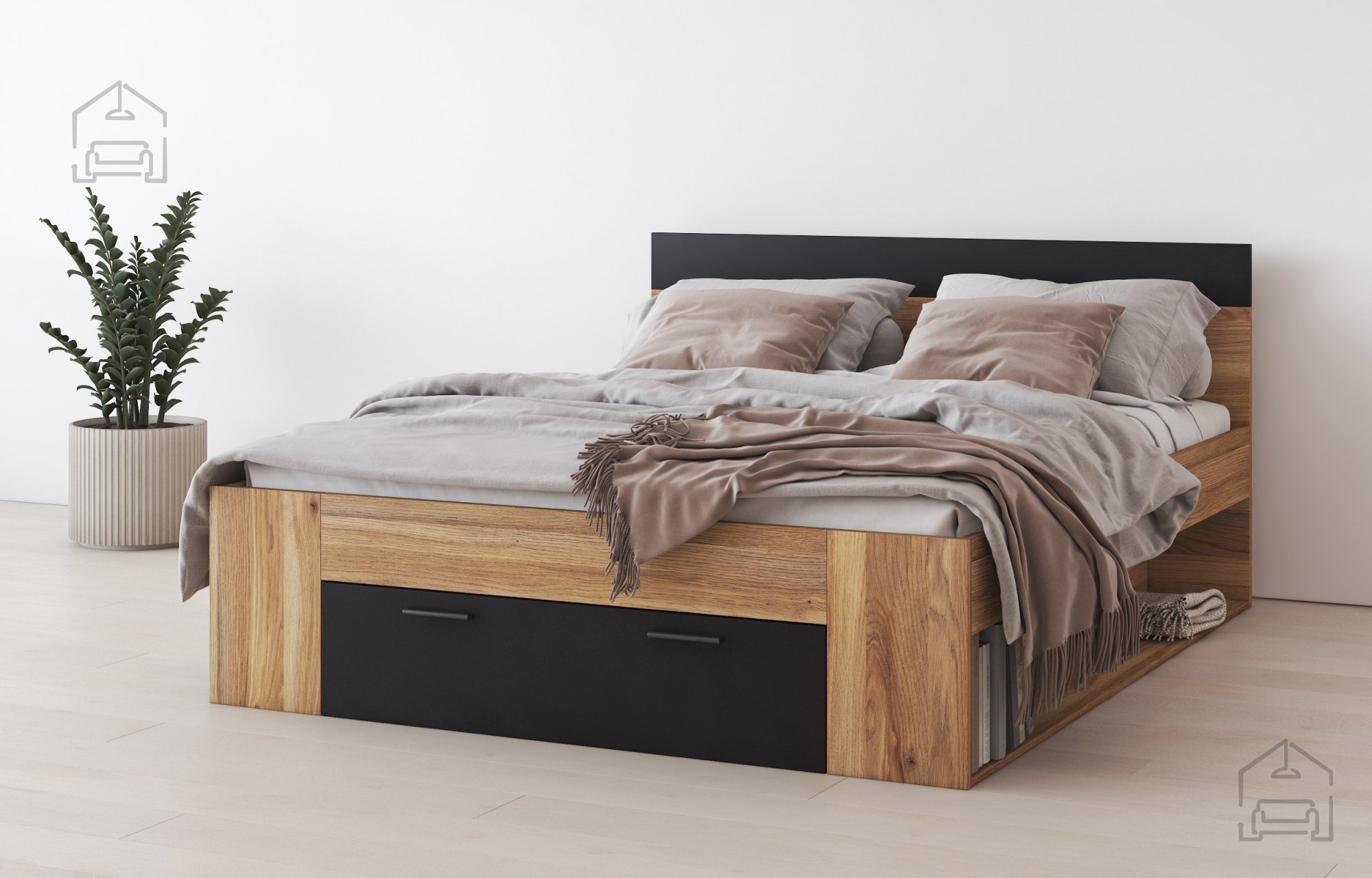 - Ästhetische Attraktivität: Mit seiner modernen Form und den eleganten Linien wird das Bett Beta zum Mittelpunkt jedes Schlafzimmers. Die Farbkombination aus Mauvella Eiche und Schwarz verleiht Ihrem Raum einen Hauch von Luxus und Raffinesse.