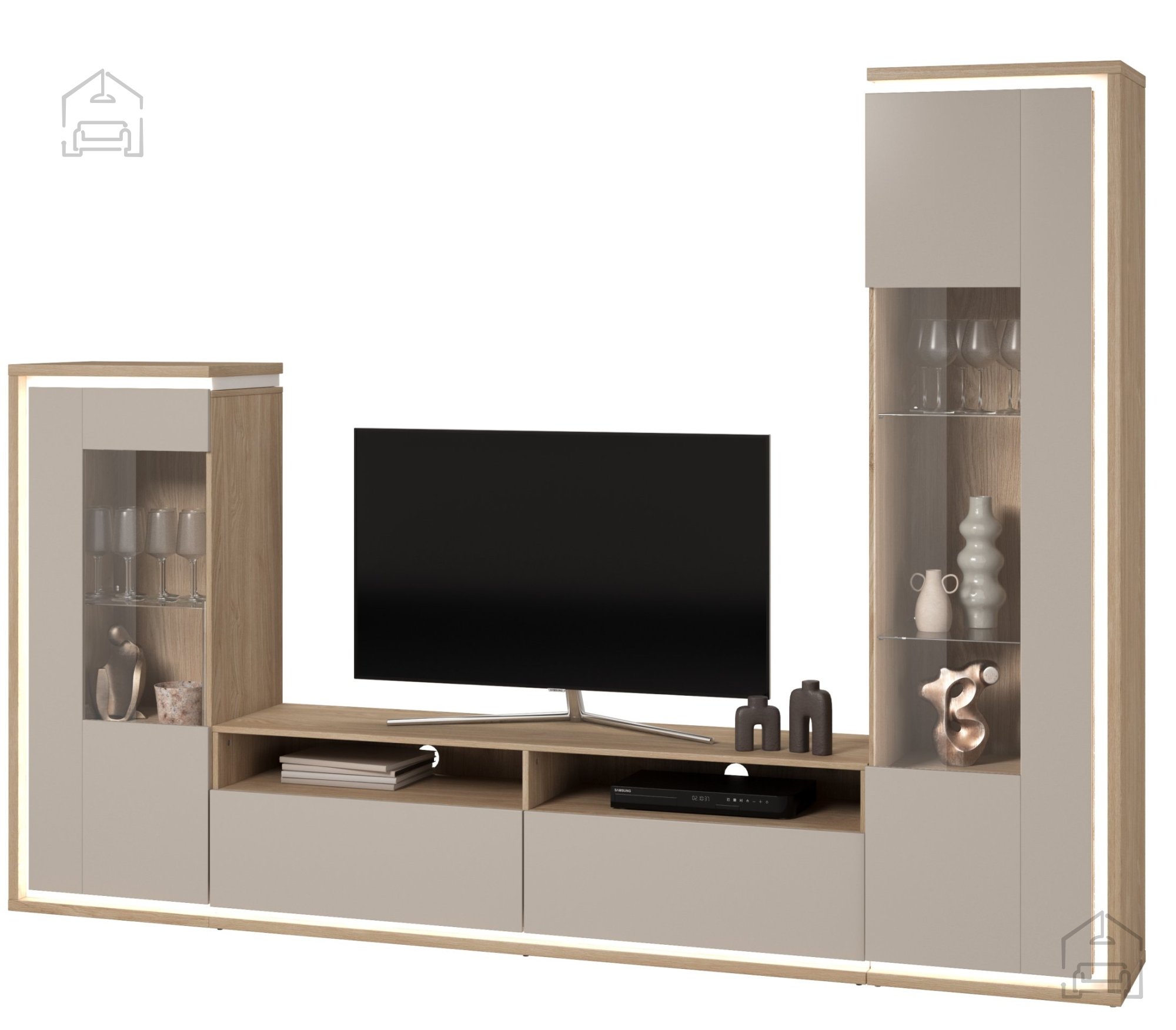 Für alle, die ihrem Wohnzimmer einen modernen Akzent verleihen möchten, gibt es die Option einer LED-Beleuchtung gegen Aufpreis. Die LED-Lichter verbessern nicht nur die Ästhetik der Wohnwand, sondern schaffen auch eine angenehme und warme Atmosphäre – ideal für gemütliche Abende mit Familie oder Freunden.