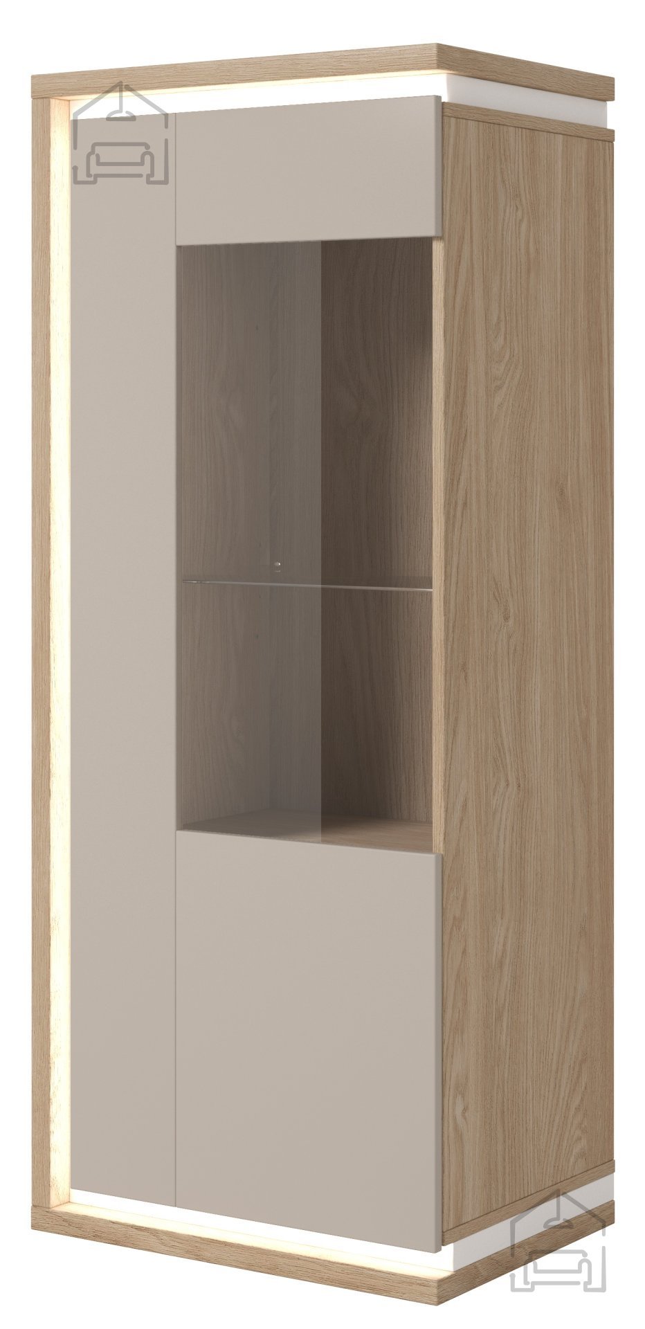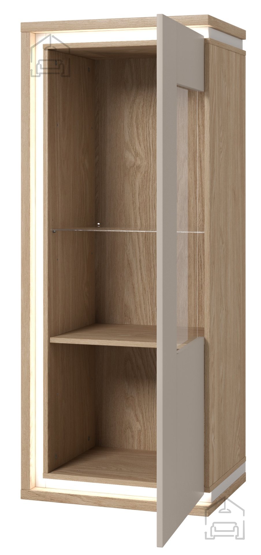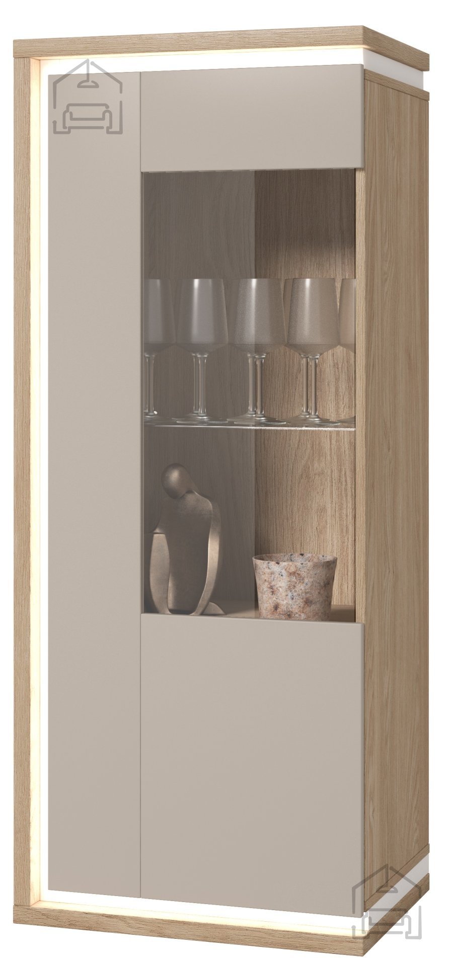 Die Vitrine Dore ist in der eleganten Farbe geölte Eiche-Kashmir erhältlich, die Wärme und Raffinesse in jeden Raum bringt. Diese neutrale Farbe ermöglicht eine einfache Kombination mit verschiedenen Einrichtungsstilen, von traditionell bis modern. Ihre Oberfläche ist so gestaltet, dass sie die natürliche Holzstruktur betont und Ihrem Zuhause einen Hauch von natürlicher Schönheit verleiht.
