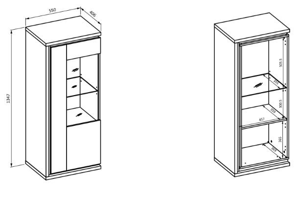 Die Vitrine Dore misst 55x41x135 cm, was bedeutet, dass sie kompakt genug ist, um in jede Ecke Ihres Zuhauses zu passen, und gleichzeitig geräumig genug, um Ihre Lieblingsdekorationsstücke zu präsentieren. Sie ist aus laminierter Spanplatte gefertigt, die Langlebigkeit und eine lange Lebensdauer garantiert. Dieses Material ist bekannt für seine Kratz-, Feuchtigkeits- und Abnutzungsbeständigkeit, was bedeutet, dass Ihre Vitrine lange ihr schönes Aussehen behält.