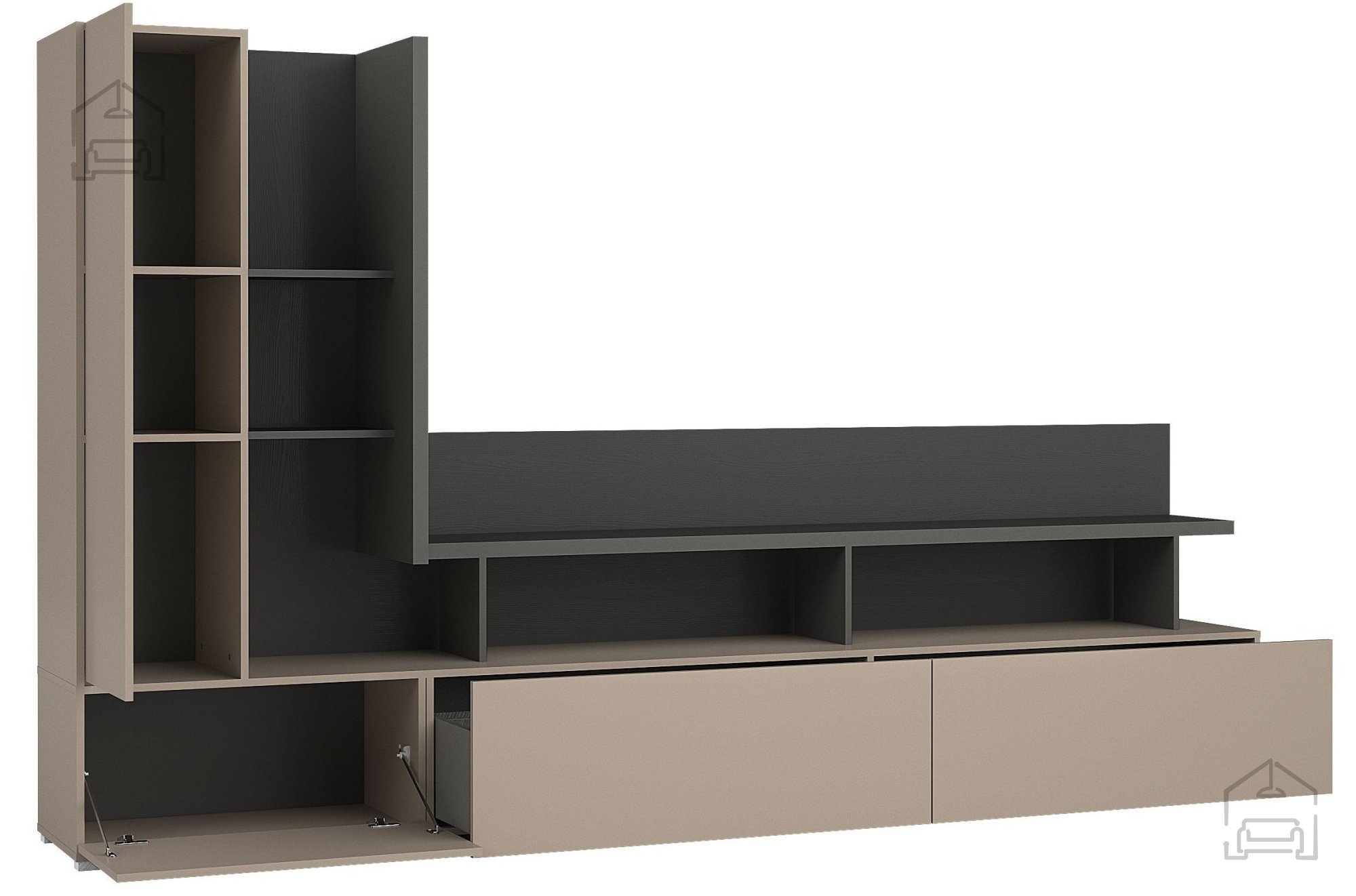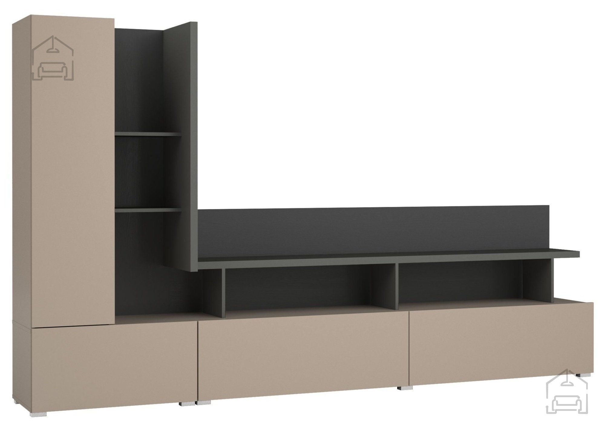2. Moderne Ästhetik: Die neutralen Farbtöne der Wohnwand gewährleisten, dass sie sich harmonisch mit den übrigen Elementen Ihres Raumes verbindet. Die Kombination der Farben Kongo-Anthrazit-Schwarz/Kongo schafft ein modernes und stilvolles Erscheinungsbild, das Ihrem Zuhause Eleganz und Raffinesse verleiht. Diese Wohnwand ist die perfekte Wahl für alle, die ihrem Raum einen Hauch von Modernität verleihen möchten.