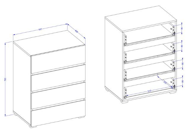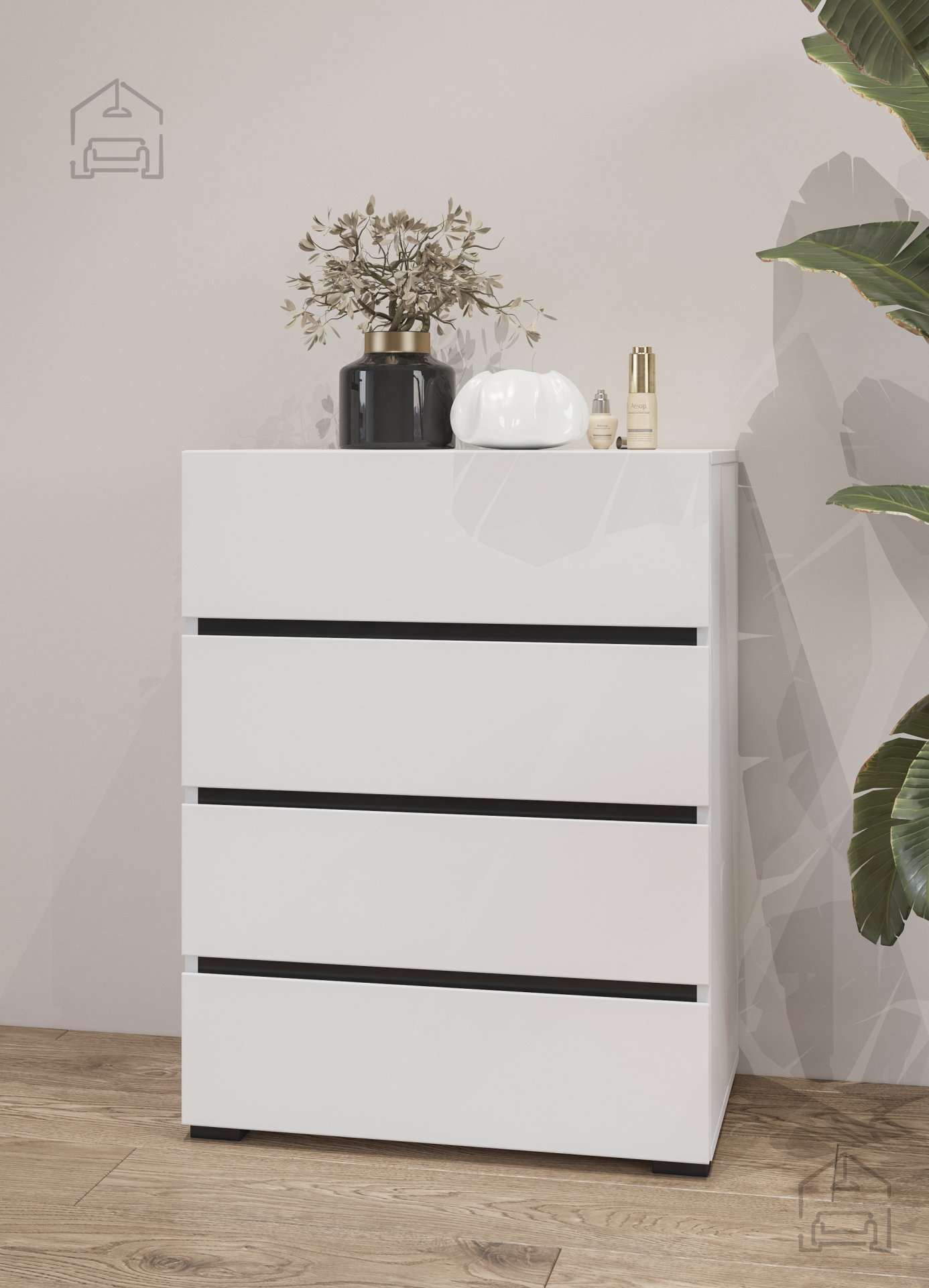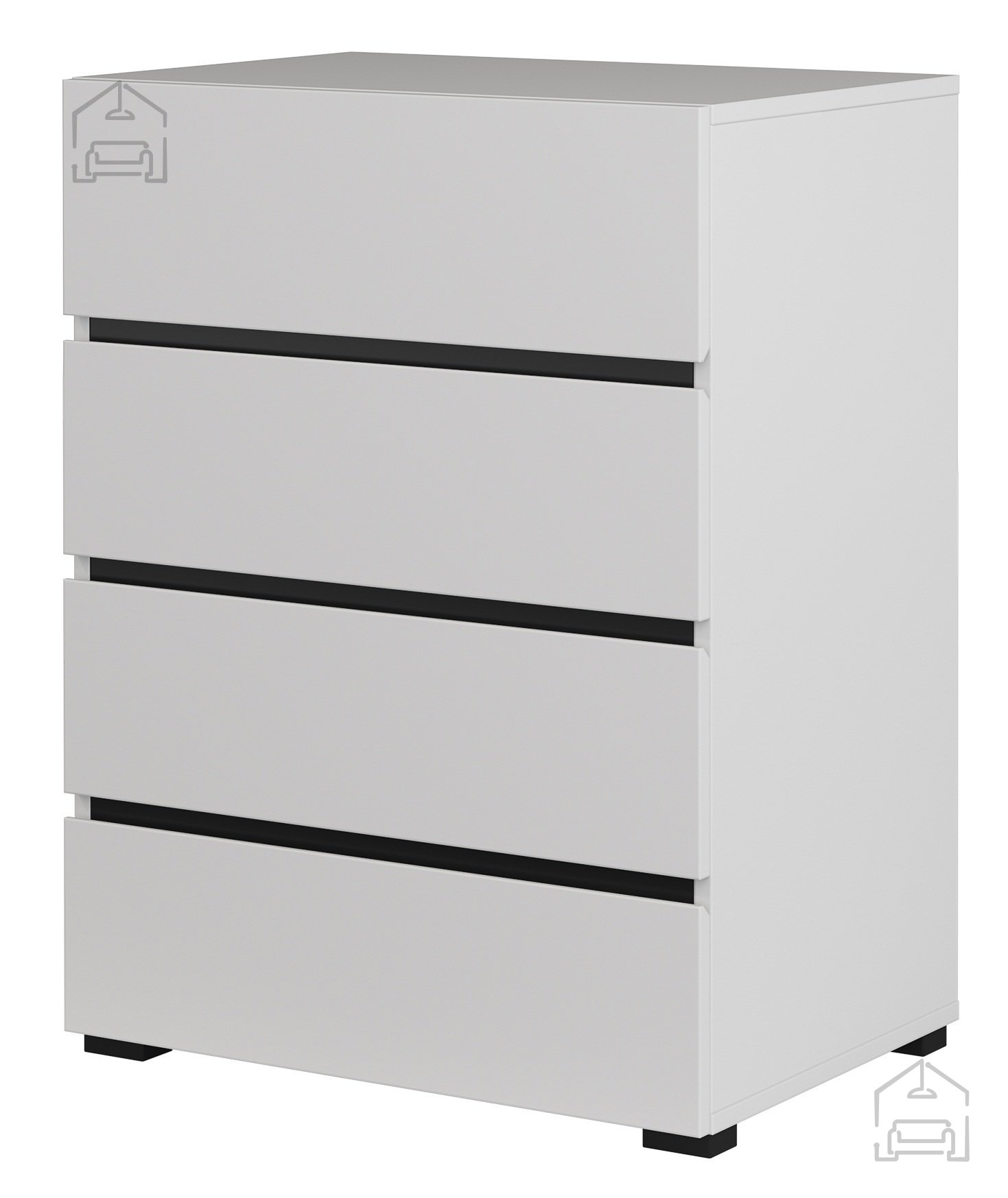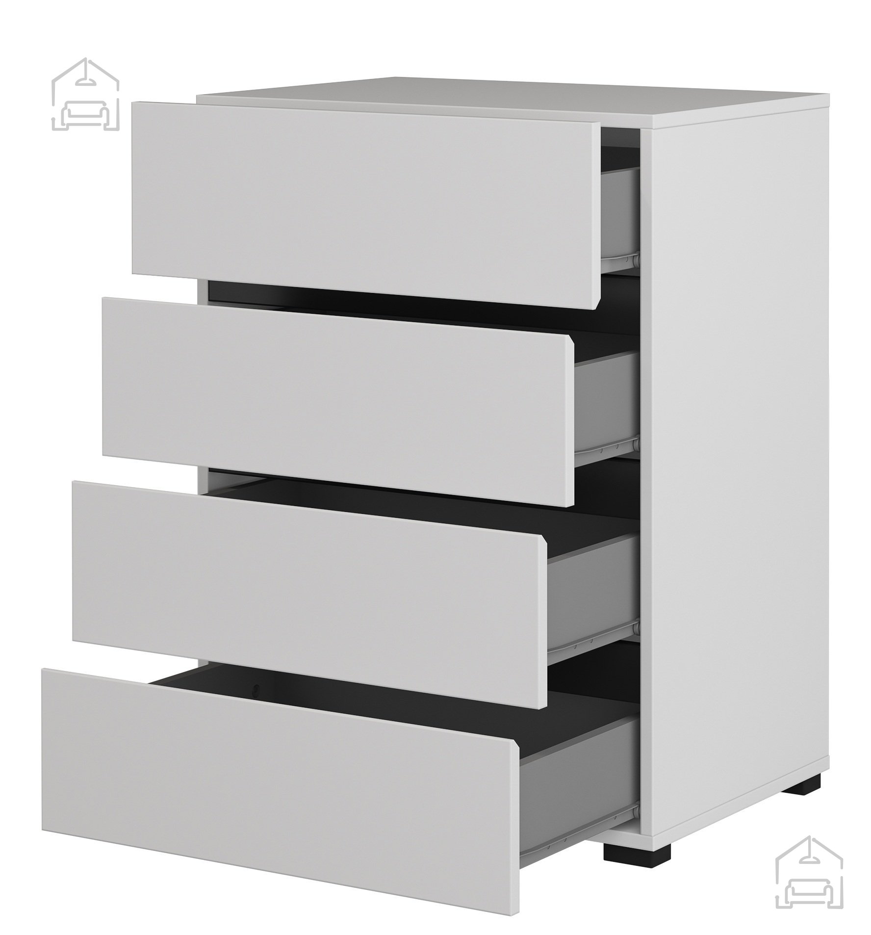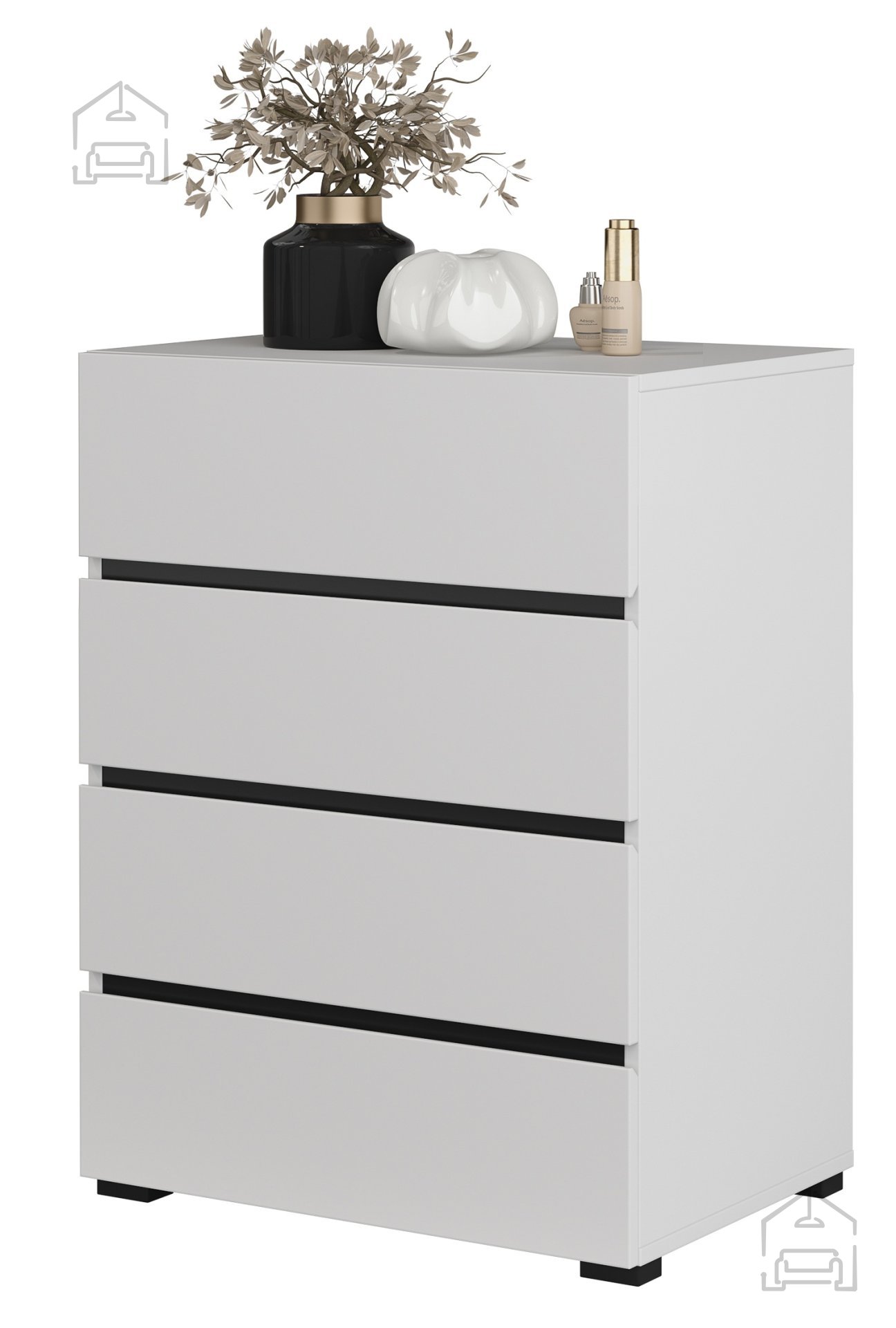 Die Kommode Cross verfügt über vier geräumige Schubladen, die eine ordentliche Aufbewahrung Ihrer Gegenstände ermöglichen. Ob Sie Platz für Kleidung, Dokumente oder andere persönliche Dinge benötigen – diese Kommode bietet ausreichend Stauraum für alle Ihre Bedürfnisse. Die Schubladen sind mit leichtgängigen Schienen ausgestattet, die ein einfaches Öffnen und Schließen ermöglichen, während die minimalistischen Griffe für ein elegantes Erscheinungsbild sorgen.