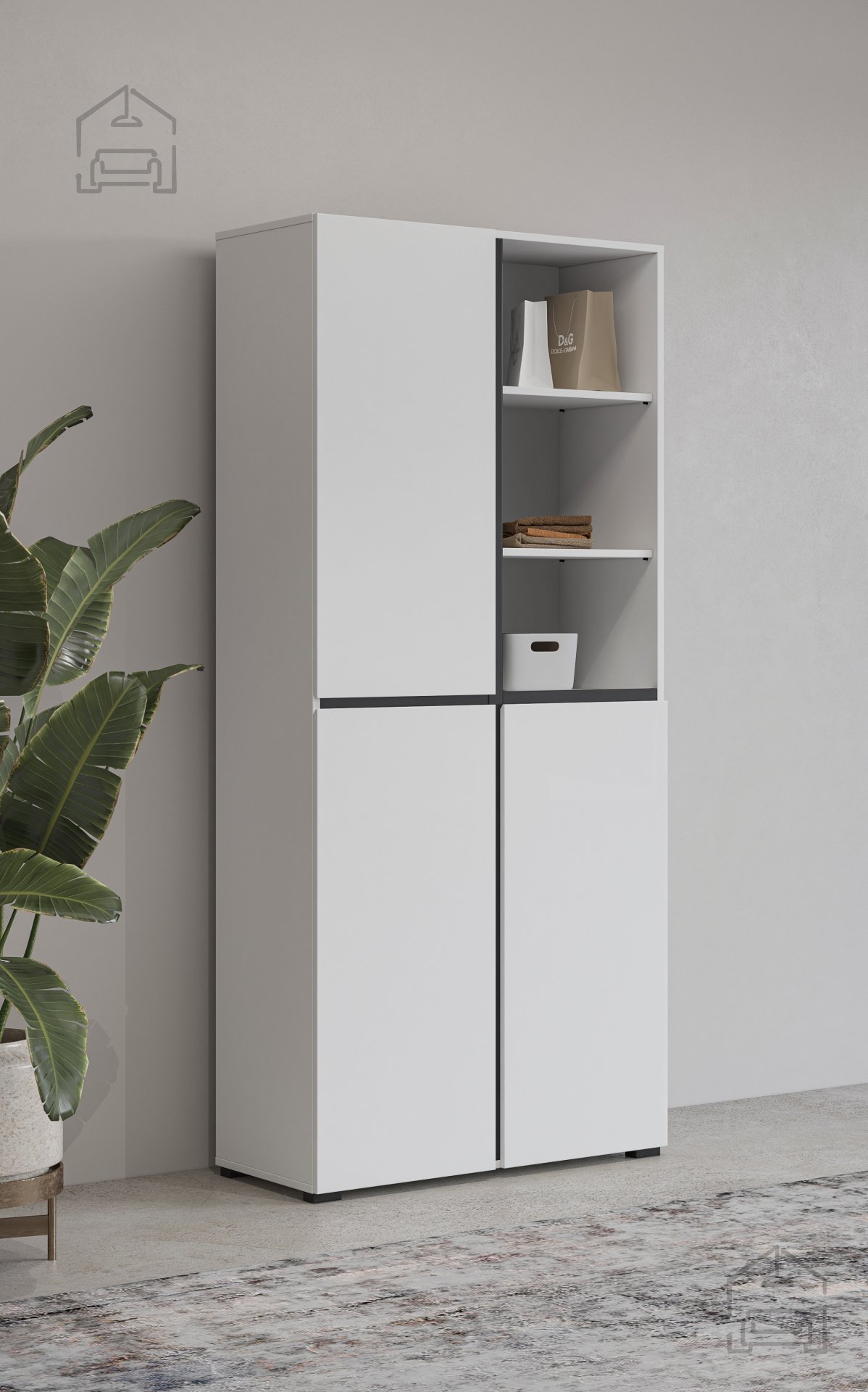Gefertigt aus hochwertigem MDF-Material, garantiert der Kleiderschrank Cross eine lange Lebensdauer und außergewöhnliche Stabilität. MDF, bekannt für seine Widerstandsfähigkeit gegen Feuchtigkeit und Verformungen, ist das perfekte Material für die Herstellung von Möbeln, die ihre Form und Schönheit lange Zeit behalten. Die weiß/weiß-schwarze Farbkombination verleiht einen Hauch moderner Eleganz, die sich mühelos in verschiedene Einrichtungsstile einfügt – von minimalistisch bis klassisch.