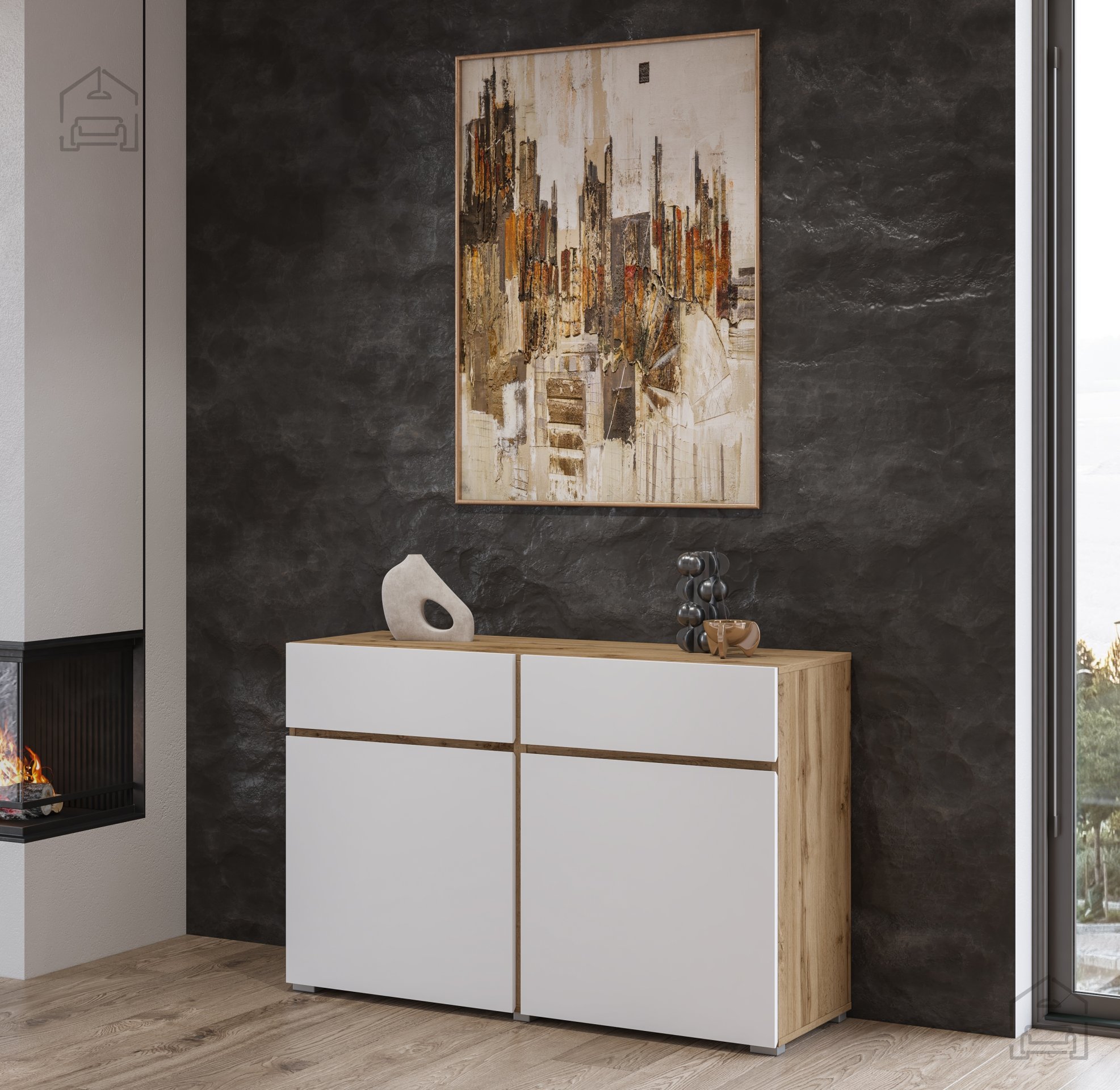 Die Farbkombination aus Votan-Eiche und Weiß verleiht dem Raum ein natürliches und elegantes Erscheinungsbild. Dieses Farbschema ermöglicht eine einfache Integration der Kommode in verschiedene Einrichtungsstile, von modern bis klassisch. Darüber hinaus betont das Weiß die Helligkeit im Raum, während der Eichenton ein Gefühl von Wärme und Behaglichkeit hinzufügt.