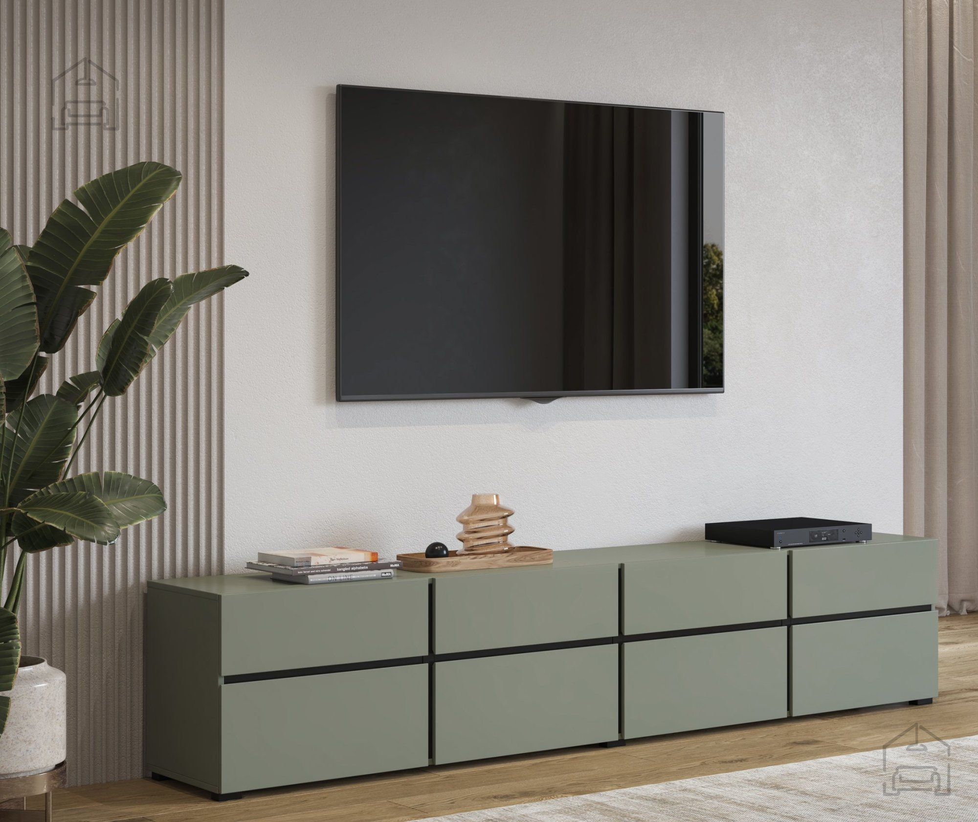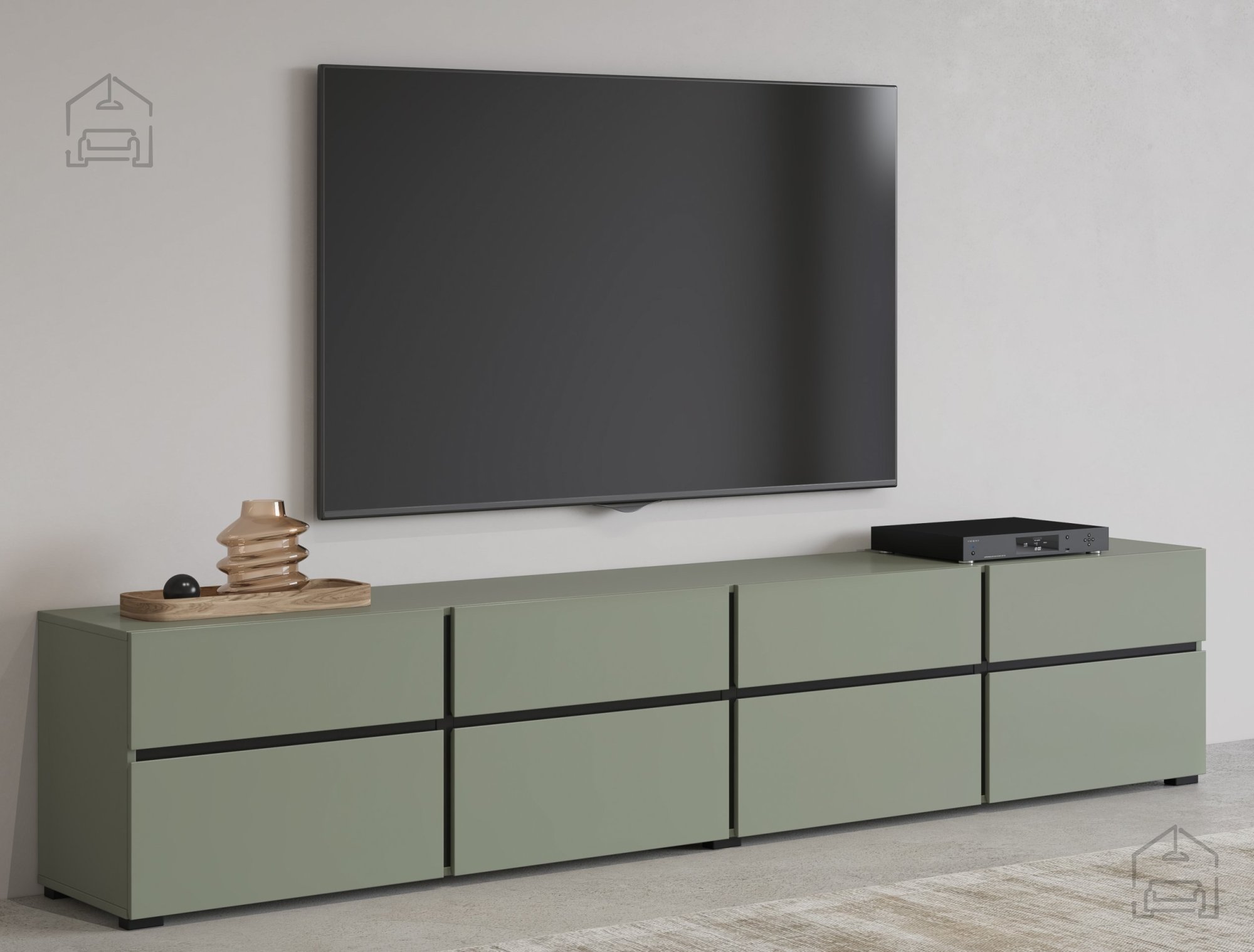 Entdecken Sie die perfekte Kombination aus modernem Design und Praktikabilität mit der TV-Kommode Cross in edlem Grün und kontrastierendem Grün-Schwarz. Diese beeindruckende TV-Kommode aus hochwertigem MDF-Material ist die ideale Wahl für alle, die nach einer eleganten und funktionalen Lösung für ihr Wohnzimmer suchen. Mit ihren großzügigen Maßen von 225x40x48 cm bietet sie ausreichend Platz für Ihren Fernseher, Unterhaltungselektronik und andere Utensilien.