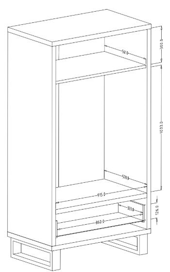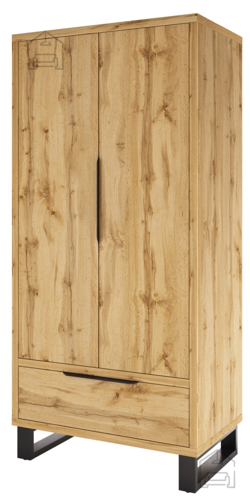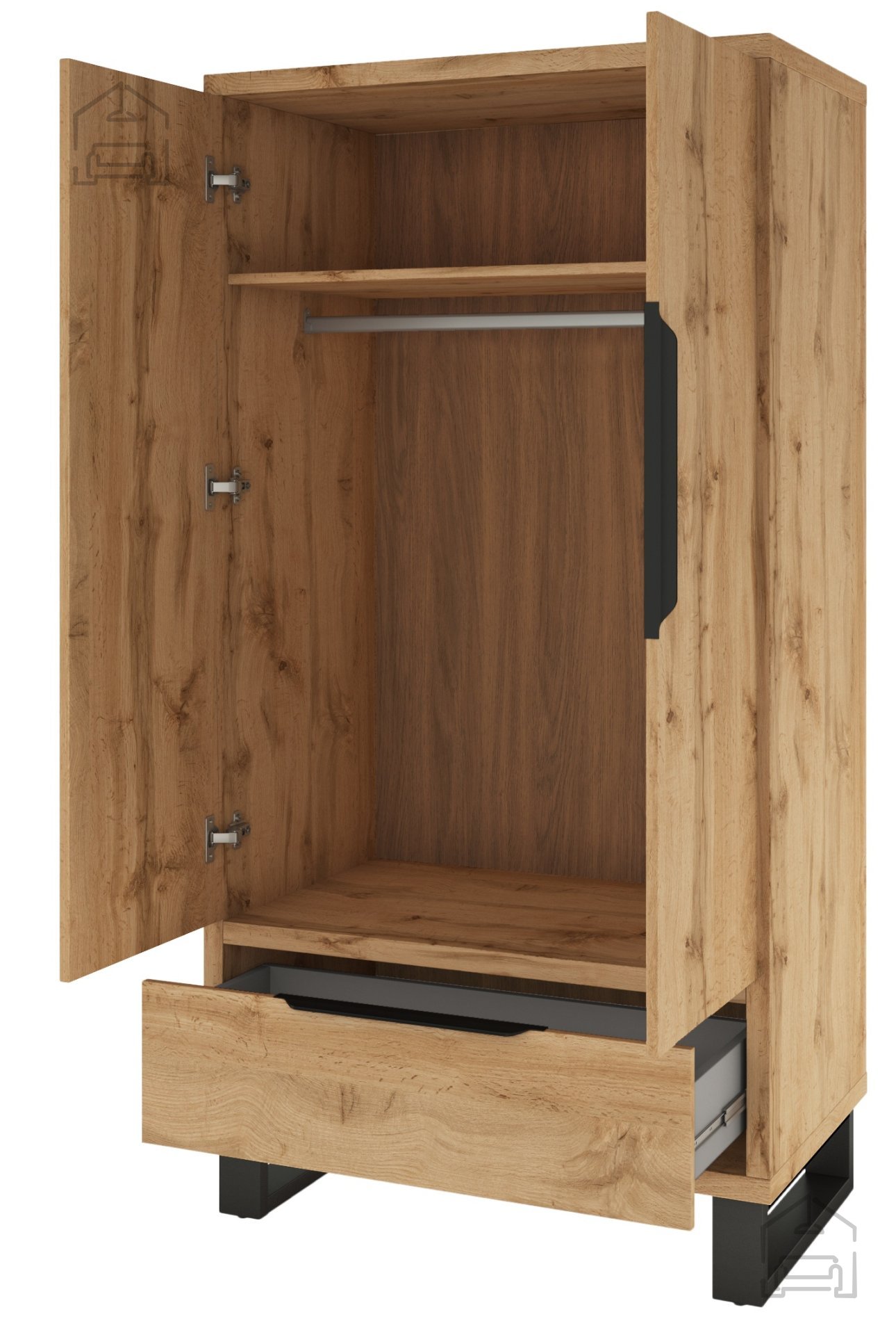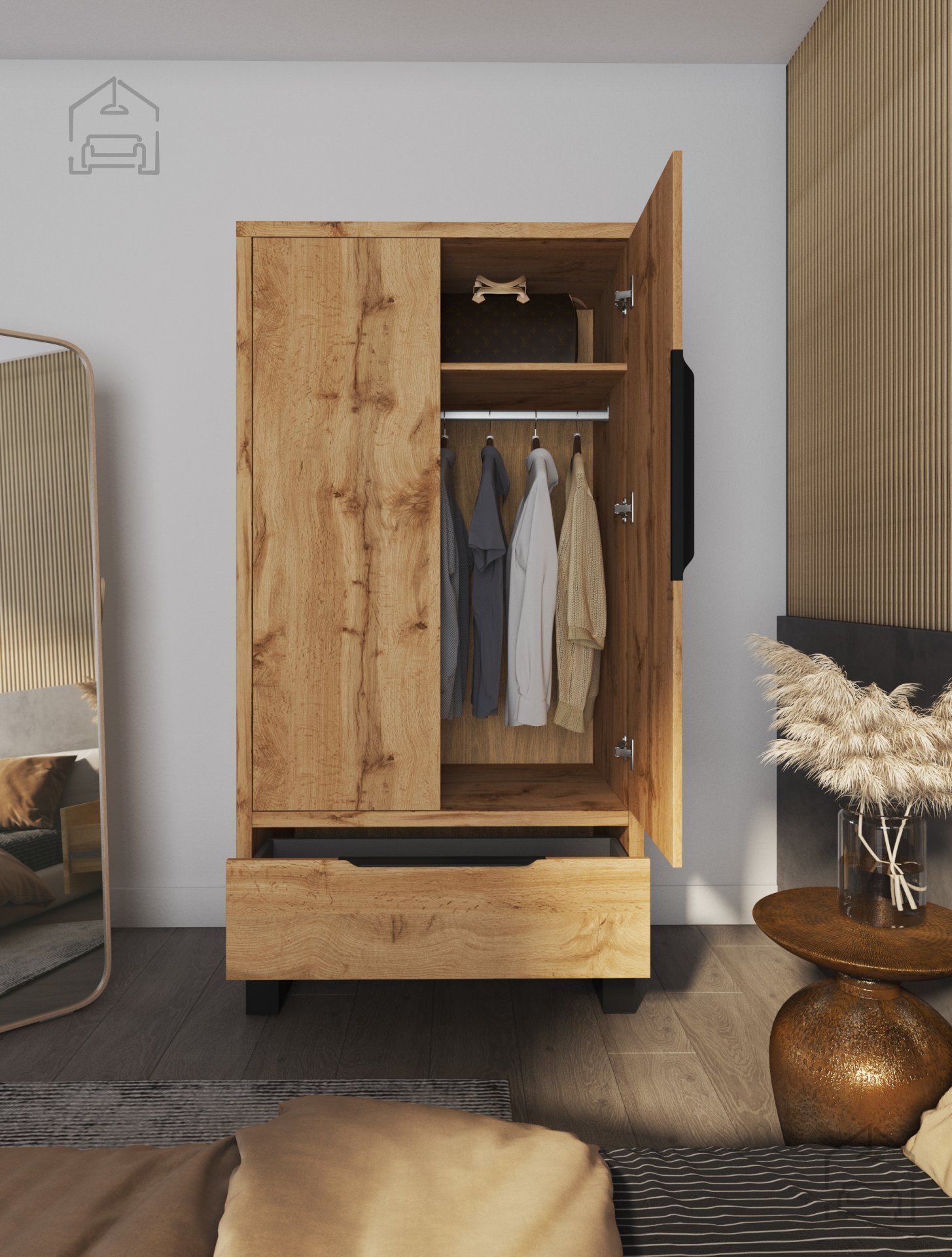 Der Kleiderschrank Halle - 24N0HK18 ist mit zwei Türen und einer Schublade ausgestattet, was eine optimale Organisation Ihrer Kleidung und Accessoires ermöglicht. Das Innere des Schranks ist geräumig und flexibel, sodass Sie Kleidung, Schuhe und andere persönliche Gegenstände problemlos verstauen können. Die Schublade eignet sich ideal zur Aufbewahrung kleinerer Gegenstände, die Sie griffbereit haben möchten.