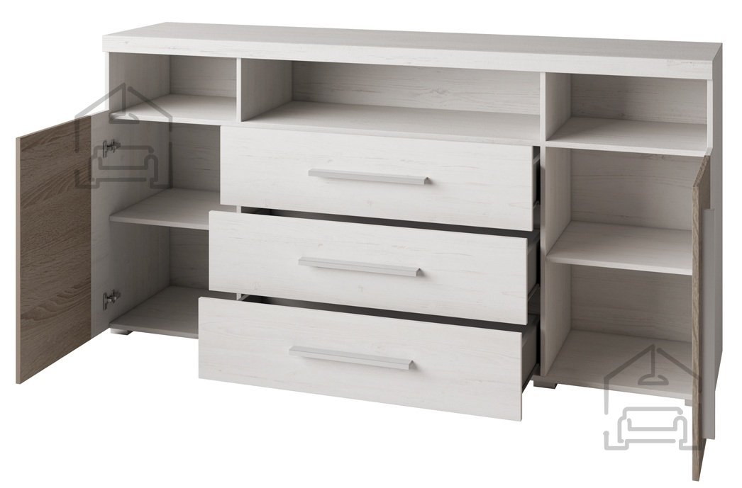 Die Kommode Roger verfügt über 2 Türen und 3 Schubladen, sodass Sie verschiedene Gegenstände – von Kleidung, Büchern bis hin zu dekorativen Accessoires – problemlos organisieren und aufbewahren können. Diese Raumaufteilung ist ideal für eine ordentliche und übersichtliche Aufbewahrung, sodass Sie schnell finden, was Sie benötigen.