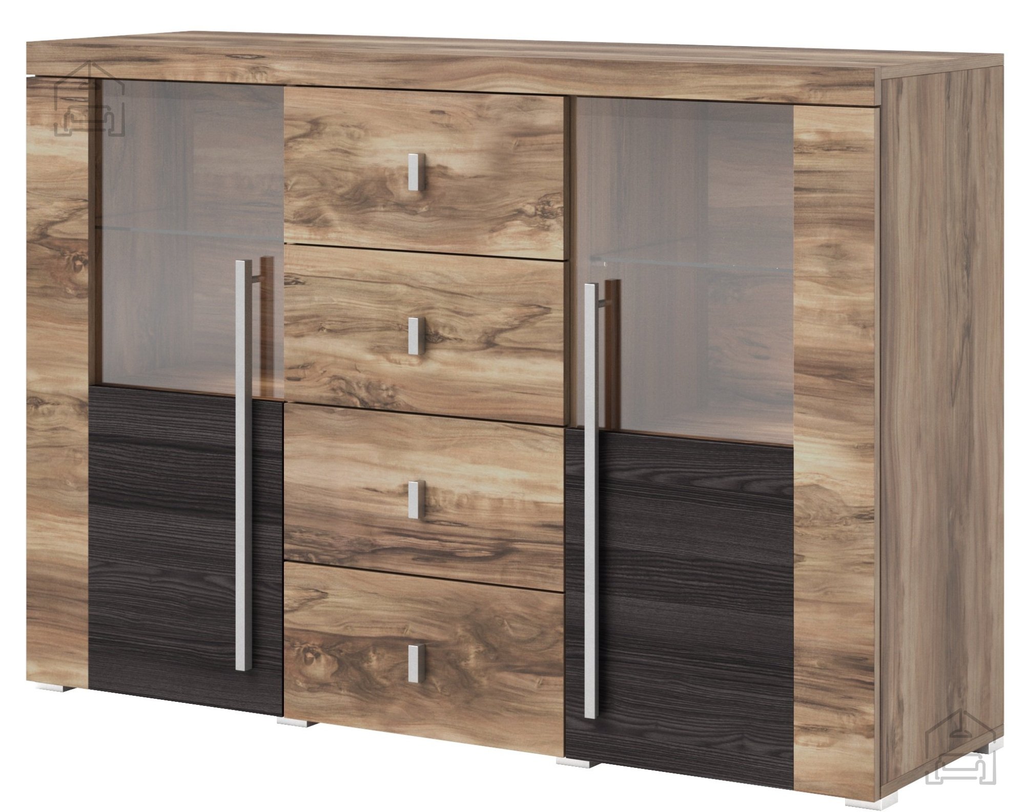 Die Kommode ist in einer raffinierten Kombination aus Nussbaum und dunkler Eiche erhältlich, was zu ihrem eleganten Erscheinungsbild beiträgt. Dieses Farbschema ermöglicht eine einfache Kombination mit verschiedenen Einrichtungsstilen, von klassisch bis modern. Das i-Tüpfelchen setzen die Kunststoffgriffe in Aluminiumfarbe, die der Kommode ein modernes und ästhetisch vollendetes Aussehen verleihen.