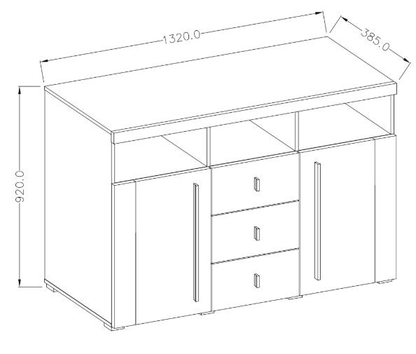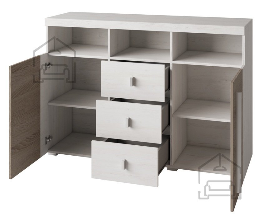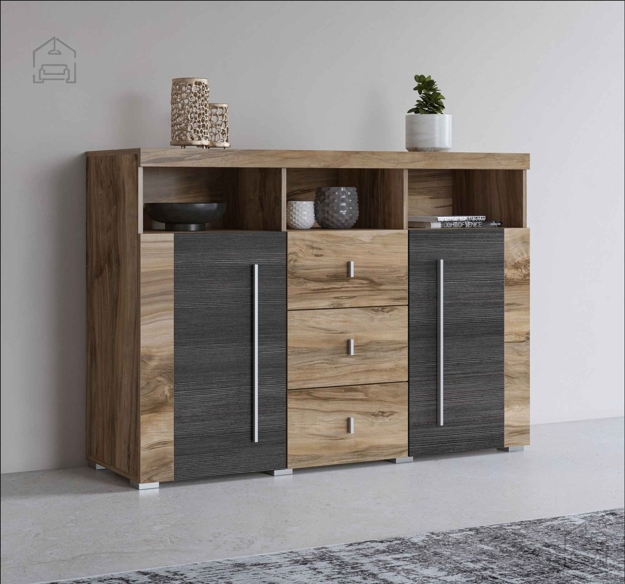 Die Maße der Kommode (132x39x92 cm) sind sorgfältig durchdacht, um den Raum optimal zu nutzen, da sie 2 Türen und 3 Schubladen umfasst. Dies ermöglicht eine organisierte Aufbewahrung Ihrer Gegenstände – von Kleidung bis zu kleineren Accessoires – ohne Kompromisse beim Stil. Die ABC-Kanten tragen zusätzlich zu mehr Sicherheit und Langlebigkeit bei.