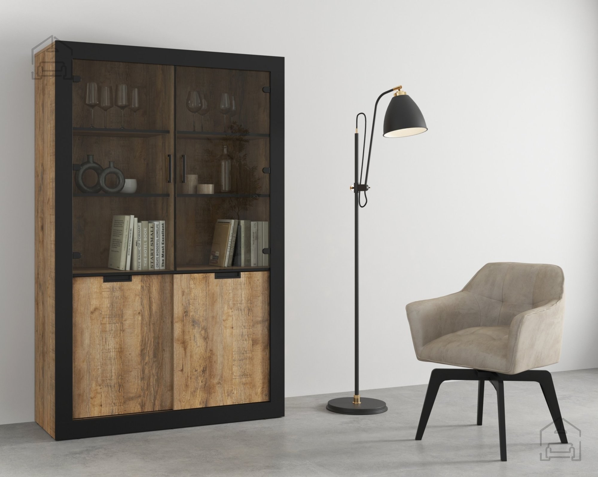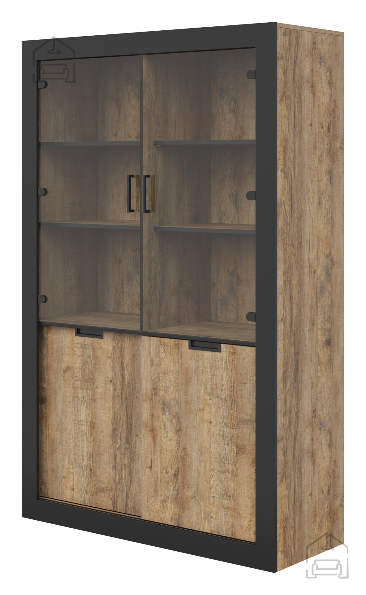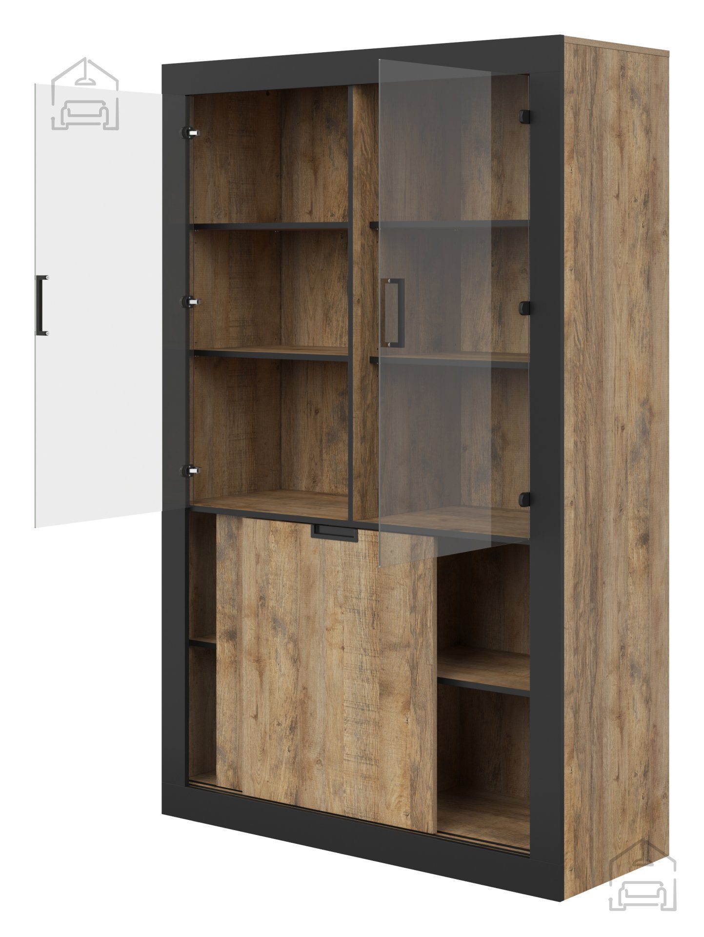Die Vitrine Tudor besticht durch ihr elegantes und modernes Design, das sich mühelos in verschiedene Wohnambiente einfügt. Die Farbkombination aus Eiche Samdal und schwarzer matter Oberfläche schafft eine warme und einladende Optik, die zum Mittelpunkt Ihres Wohn- oder Esszimmers werden kann.