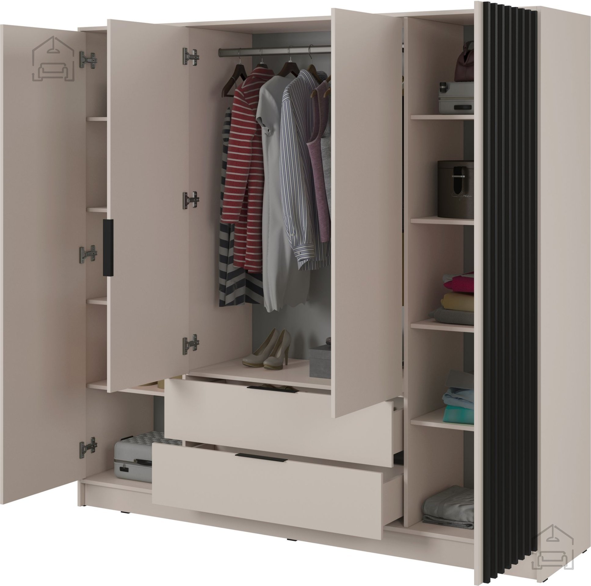 Der Schrank ist so konzipiert, dass er außergewöhnliche Praktikabilität und einfache Organisation Ihrer Kleidung bietet. Mit drei geräumigen Türen ermöglicht er einen schnellen und einfachen Zugang zum Inhalt. Das Innere des Schranks ist durchdacht in mehrere Abschnitte unterteilt, einschließlich Kleiderstangen für Kleidung, Regale für gefaltete Kleidung und Accessoires sowie Schubladen für kleinere Gegenstände. Diese Anordnung ermöglicht eine optimale Organisation und Raumausnutzung, was entscheidend für Ordnung und Übersichtlichkeit ist.