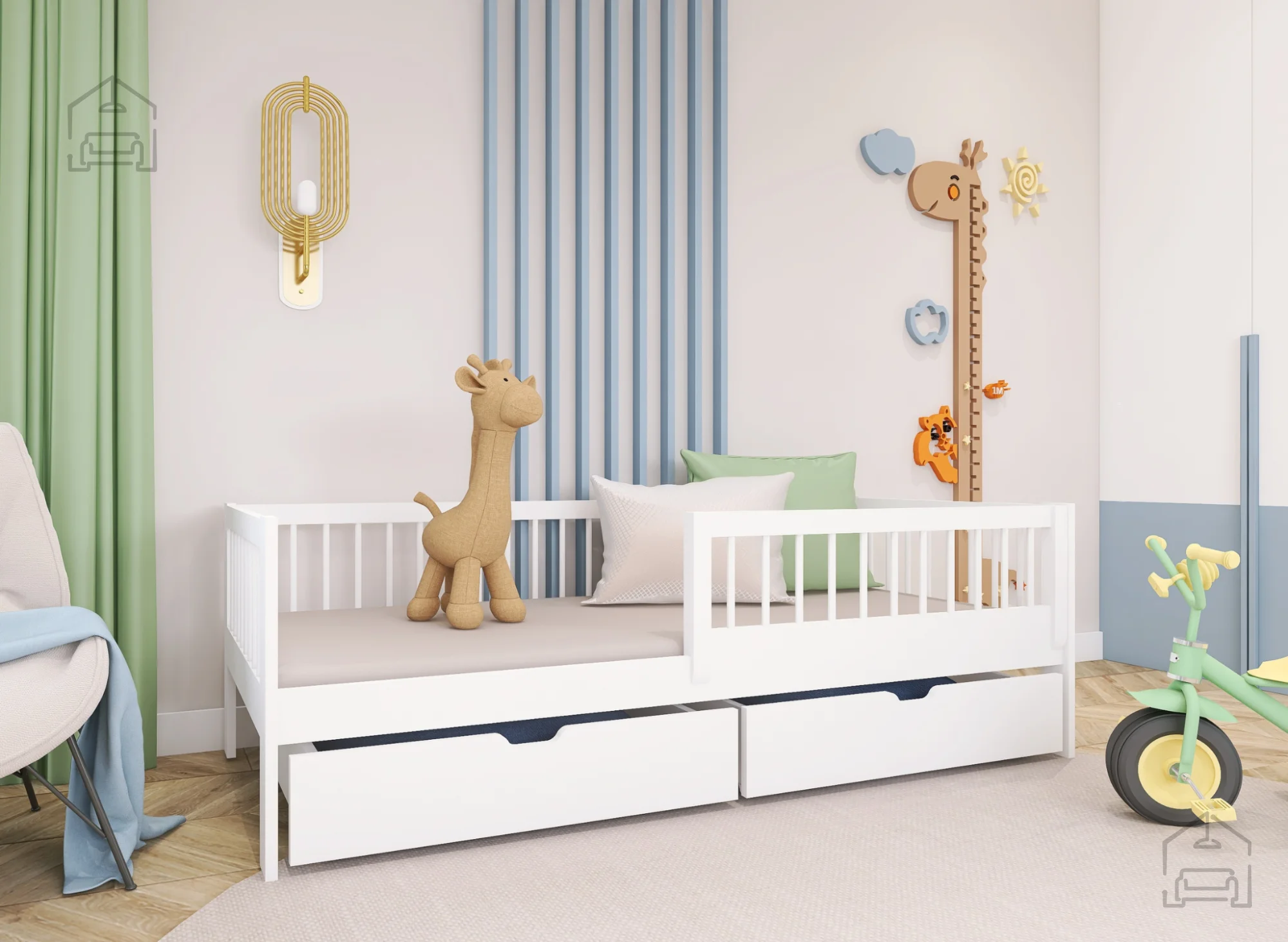 Einer der größten Vorteile des Kinderbetts Edi ist das feste, aber abnehmbare Seitenteil. Dieses Seitenteil bietet zusätzliche Sicherheit für jüngere Kinder, die sich im Schlaf oft bewegen. Wenn das Kind älter wird und mehr Platz benötigt, kann das Seitenteil einfach entfernt werden. Das Bett verfügt außerdem über zwei geräumige Schubladen, die ideal zur Aufbewahrung von Bettwäsche, Spielzeug oder anderen Kinderutensilien sind. Diese Schubladen helfen, Ordnung im Kinderzimmer zu bewahren, was entscheidend ist, um einen entspannten und organisierten Raum für Ihr Kind zu schaffen.