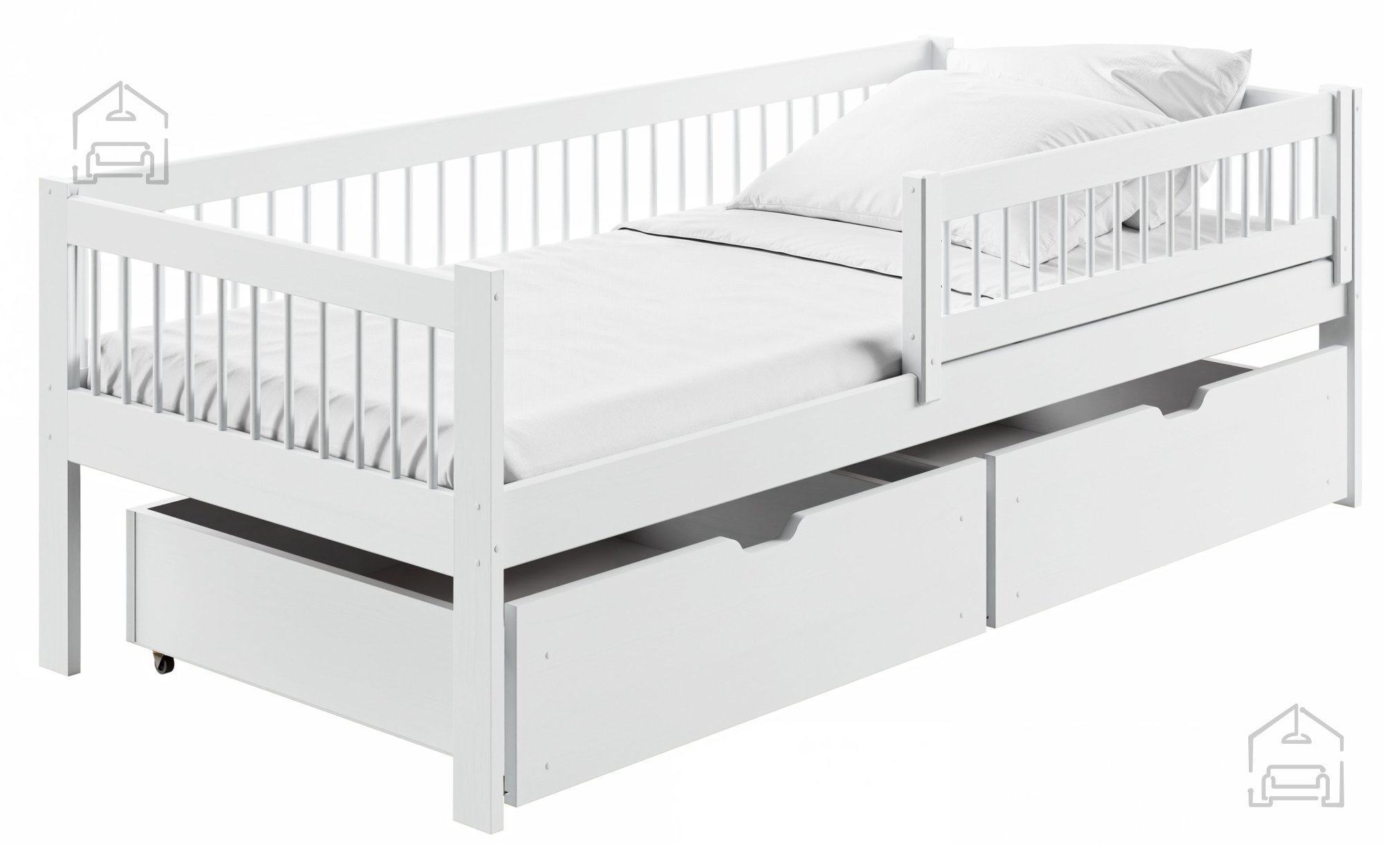 Das Kinderbett Edi - 90x200 cm - weiß ist mehr als nur ein Schlafplatz; es ist ein Möbelstück, das Funktionalität, Ästhetik und Nachhaltigkeit vereint. Mit dem inkludierten Gitter und den Schubladen sowie der Möglichkeit, eine eigene Matratze zu wählen, ist es die ideale Wahl für jedes Zuhause, das seinen Kindern einen qualitativ hochwertigen und komfortablen Schlaf bieten möchte.