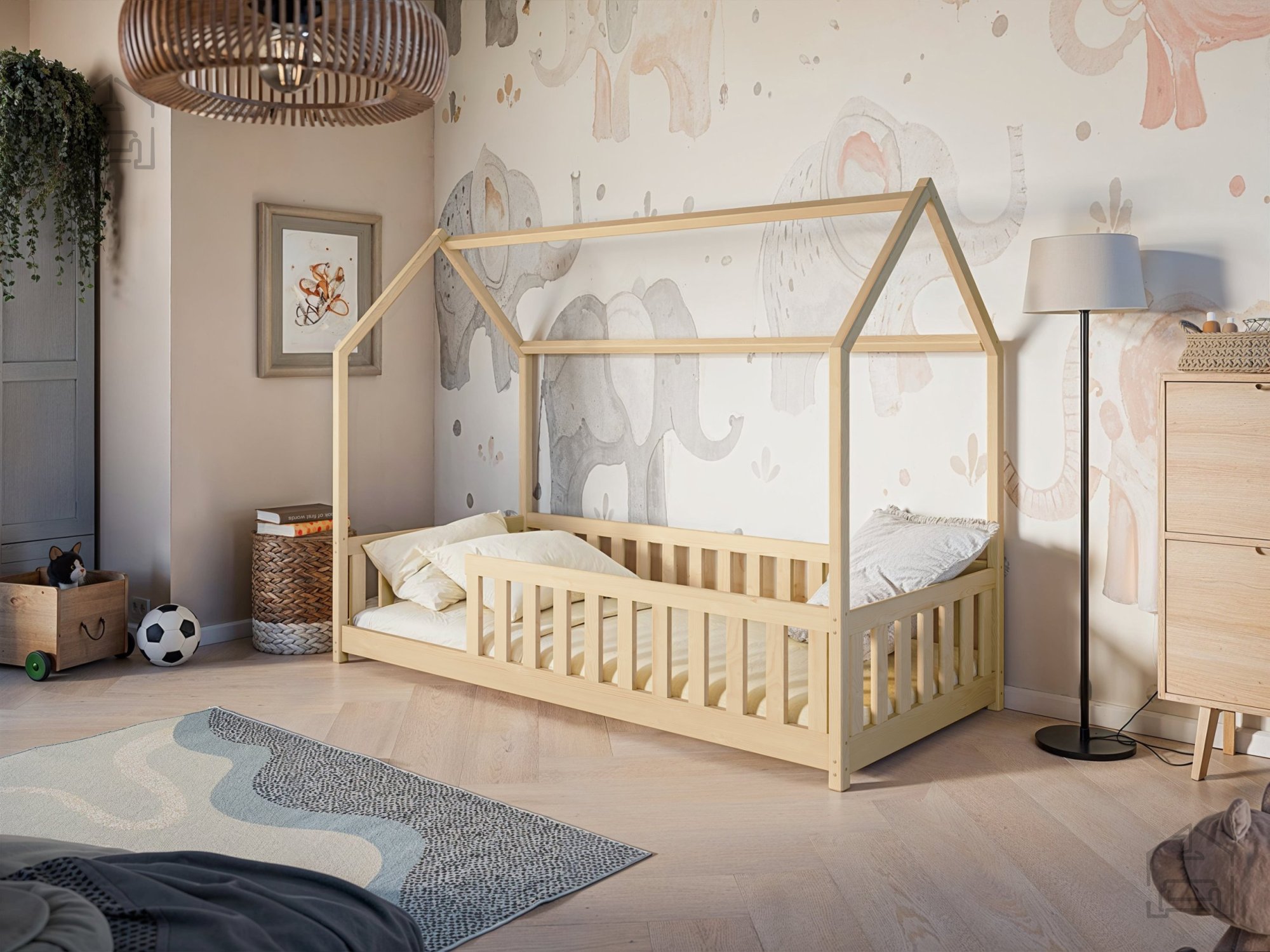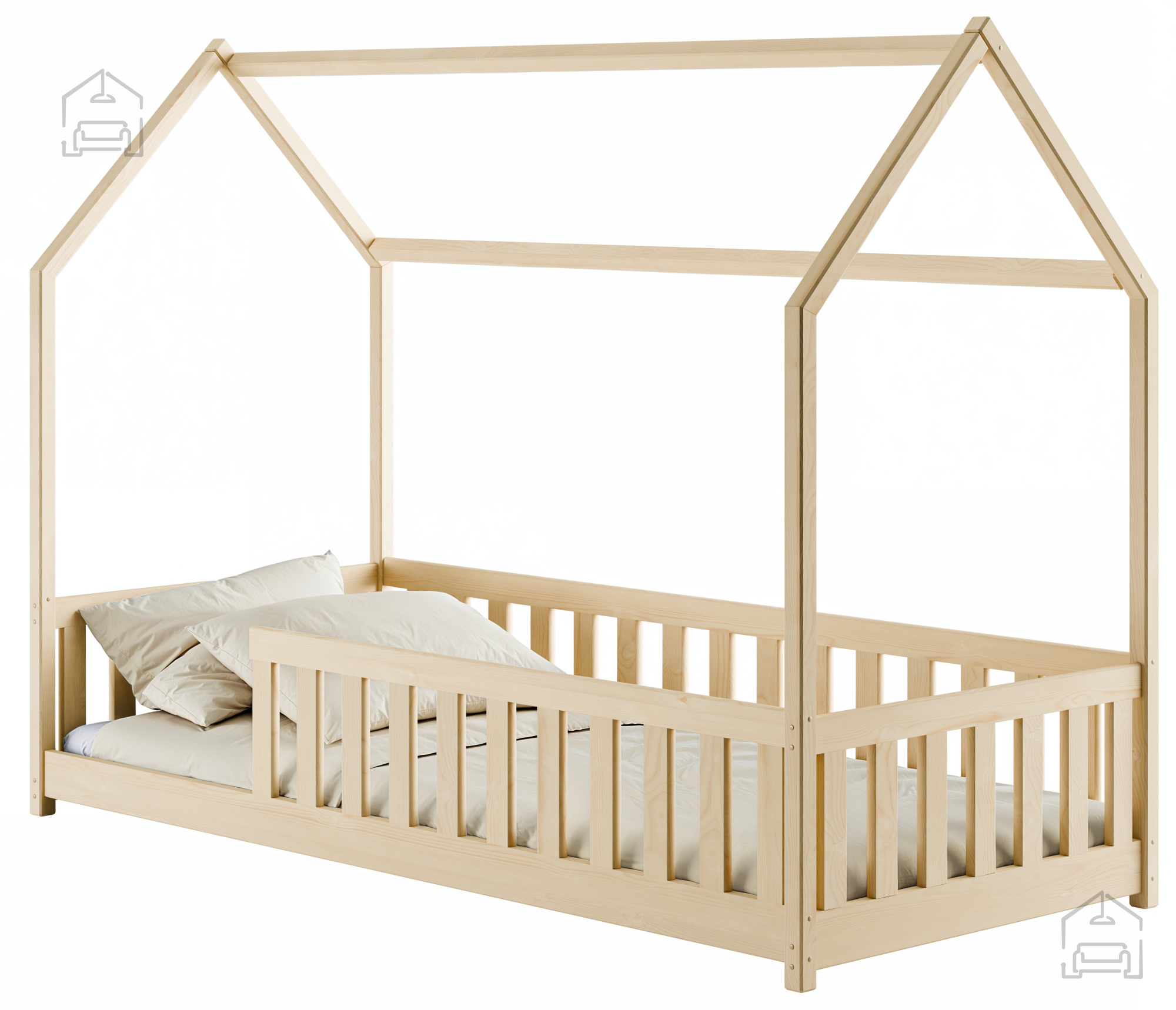Das Kinderbett Häuschen Noan ist die perfekte Wahl für alle Eltern, die einen magischen und sicheren Schlafplatz für ihre Kleinen schaffen möchten. Mit seinem einzigartigen Design in Form eines Häuschens bringt es Freude und Fantasie in jedes Kinderzimmer. Es ist aus hochwertigem Kiefernholz gefertigt, was Langlebigkeit und ein natürliches Aussehen garantiert, das sich harmonisch in verschiedene Einrichtungsstile einfügt.
