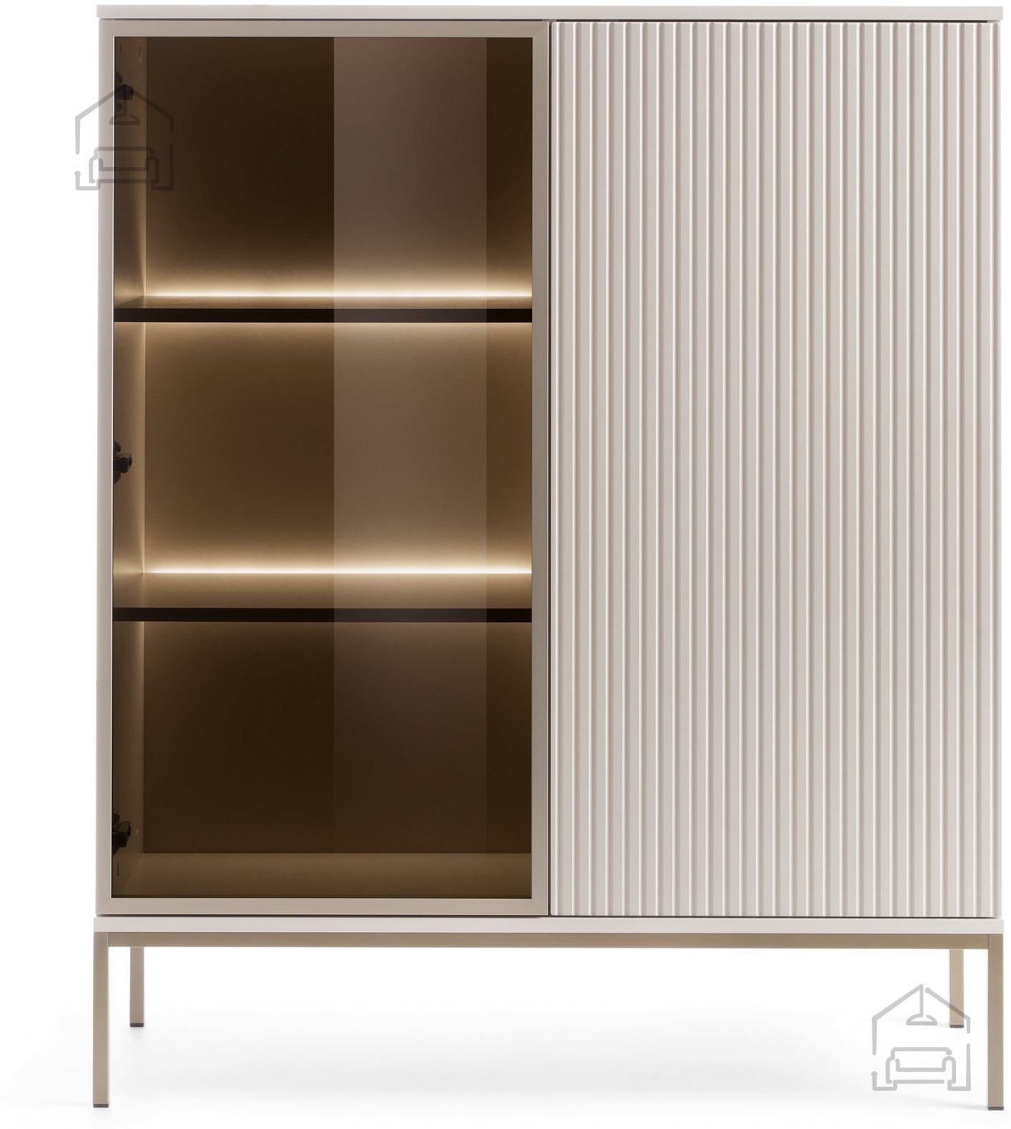 Die Vitrine Sento WT104 besteht aus hochwertigen Materialien, die Langlebigkeit und Eleganz gewährleisten. MDF-Platten mit einer Stärke von 18 mm zusammen mit laminierten Spanplatten mit einer Stärke von 16 mm bieten Festigkeit und Stabilität, die für den täglichen Gebrauch entscheidend sind. Die Materialien sind sorgfältig ausgewählt, um dem täglichen Verschleiß zu widerstehen und gleichzeitig ihr zeitloses Aussehen zu bewahren.