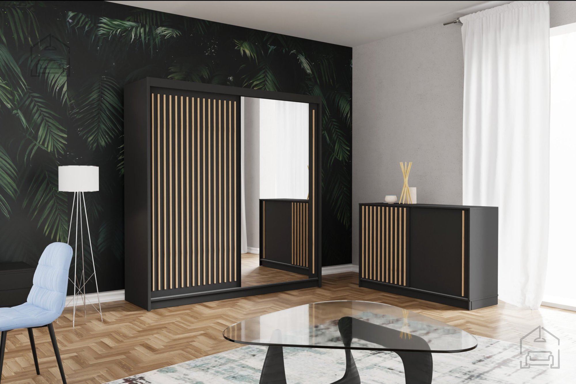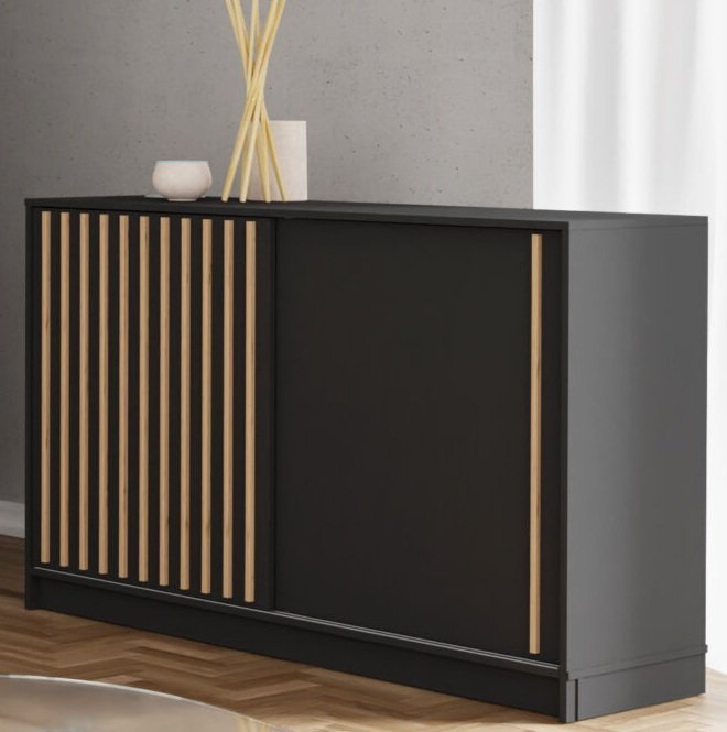 Entdecken Sie die wunderschöne Kommode Royal, die zeitlose Eleganz und erstklassige Funktionalität vereint, speziell für Ihr modernes Zuhause entworfen. Mit den Maßen 150x45x94 cm ist sie die ideale Wahl für jeden Raum, der einen Hauch von Raffinesse und Praktikabilität benötigt. Hergestellt aus hochwertiger Spanplatte, in einer eleganten Kombination aus schwarzer Farbe und Wotan-Eiche, bietet diese Kommode nicht nur ästhetischen Genuss, sondern auch langanhaltende Haltbarkeit.