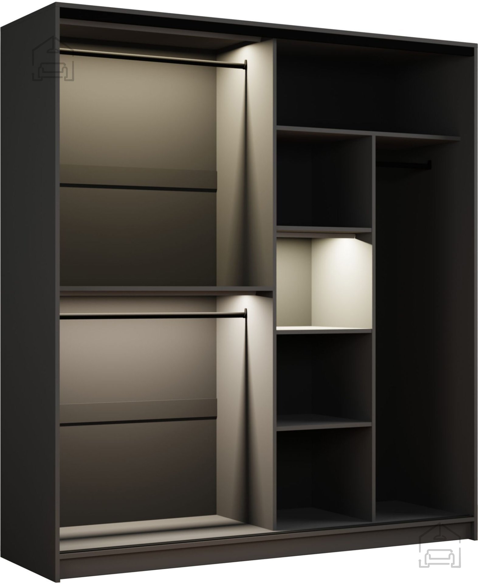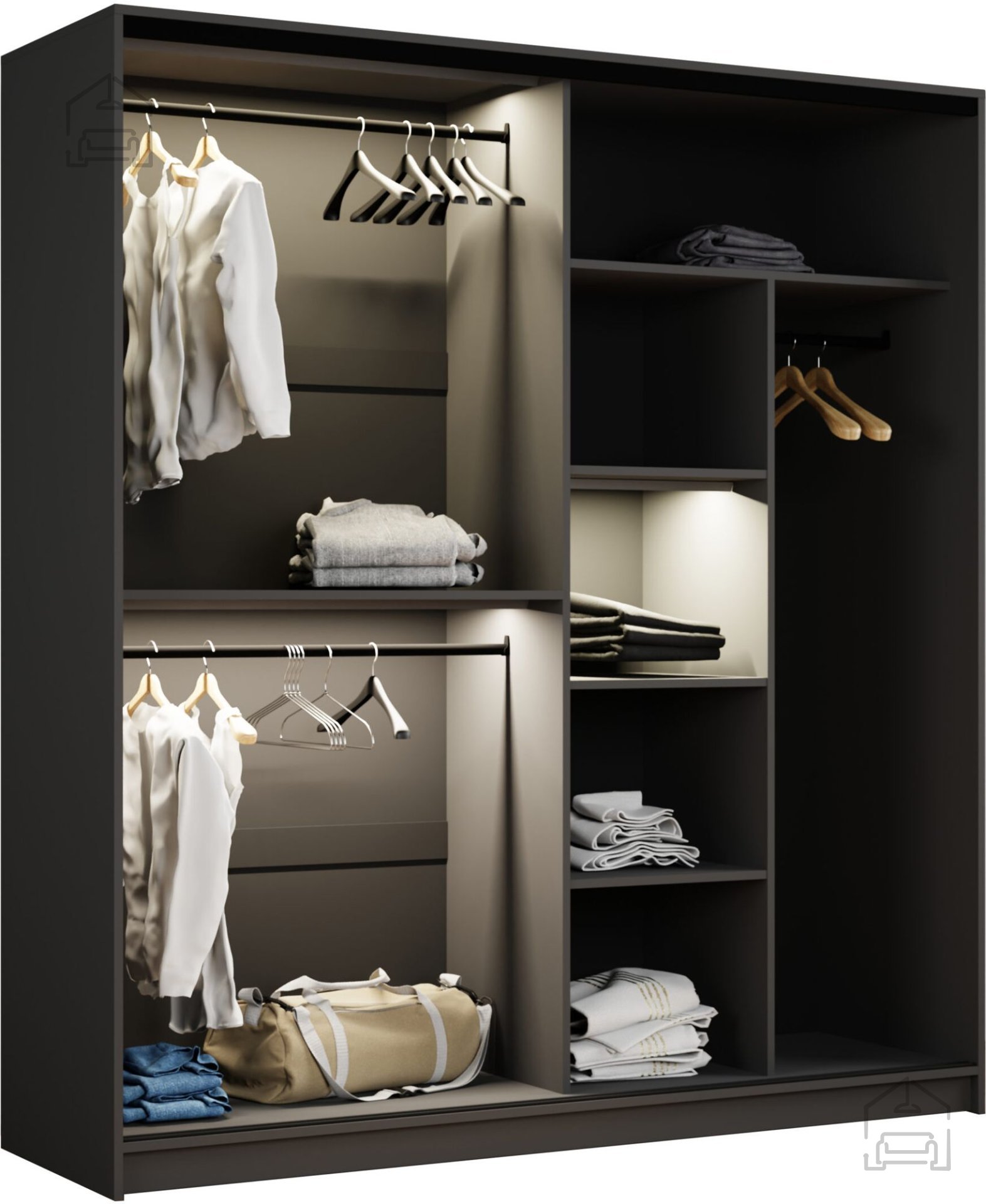 Mit einem durchdachten Design bietet der Kleiderschrank Dream ausreichend Platz für die Organisation Ihrer Kleidung, Schuhe und Accessoires. Das Innere des Schranks ist sorgfältig mit mehreren Regalen und Kleiderstangen geplant, was eine einfache Anordnung und einen schnellen Zugriff auf Ihre Sachen ermöglicht. Darüber hinaus sorgt die LED-Beleuchtung für Übersichtlichkeit und erleichtert das Finden auch in dunkleren Räumen.