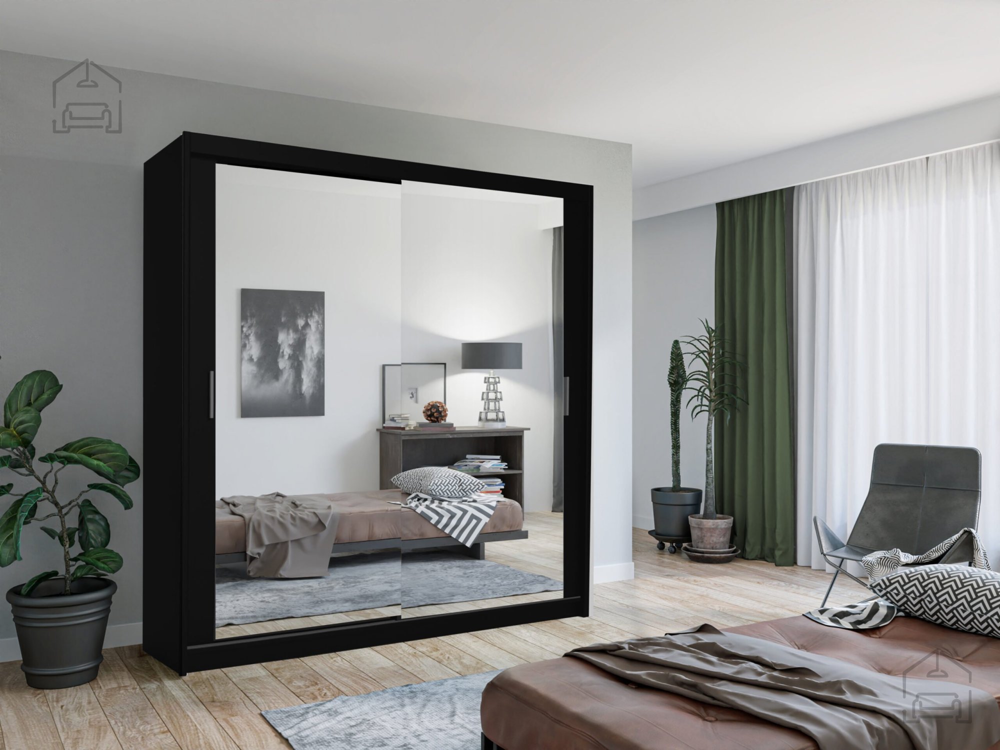 Der Kleiderschrank Lux 203 cm in elegantem Schwarz ist die perfekte Wahl für alle, die eine Kombination aus Funktionalität und modernem Design suchen. Hergestellt aus hochwertiger Spanplatte und mit einem Spiegel ausgestattet, verleiht dieser Schrank Ihrem Schlafzimmer oder Flur nicht nur einen Hauch von Prestige, sondern nutzt den Raum auch praktisch und sorgt so für eine optimale Organisation Ihrer Kleidung und Accessoires.