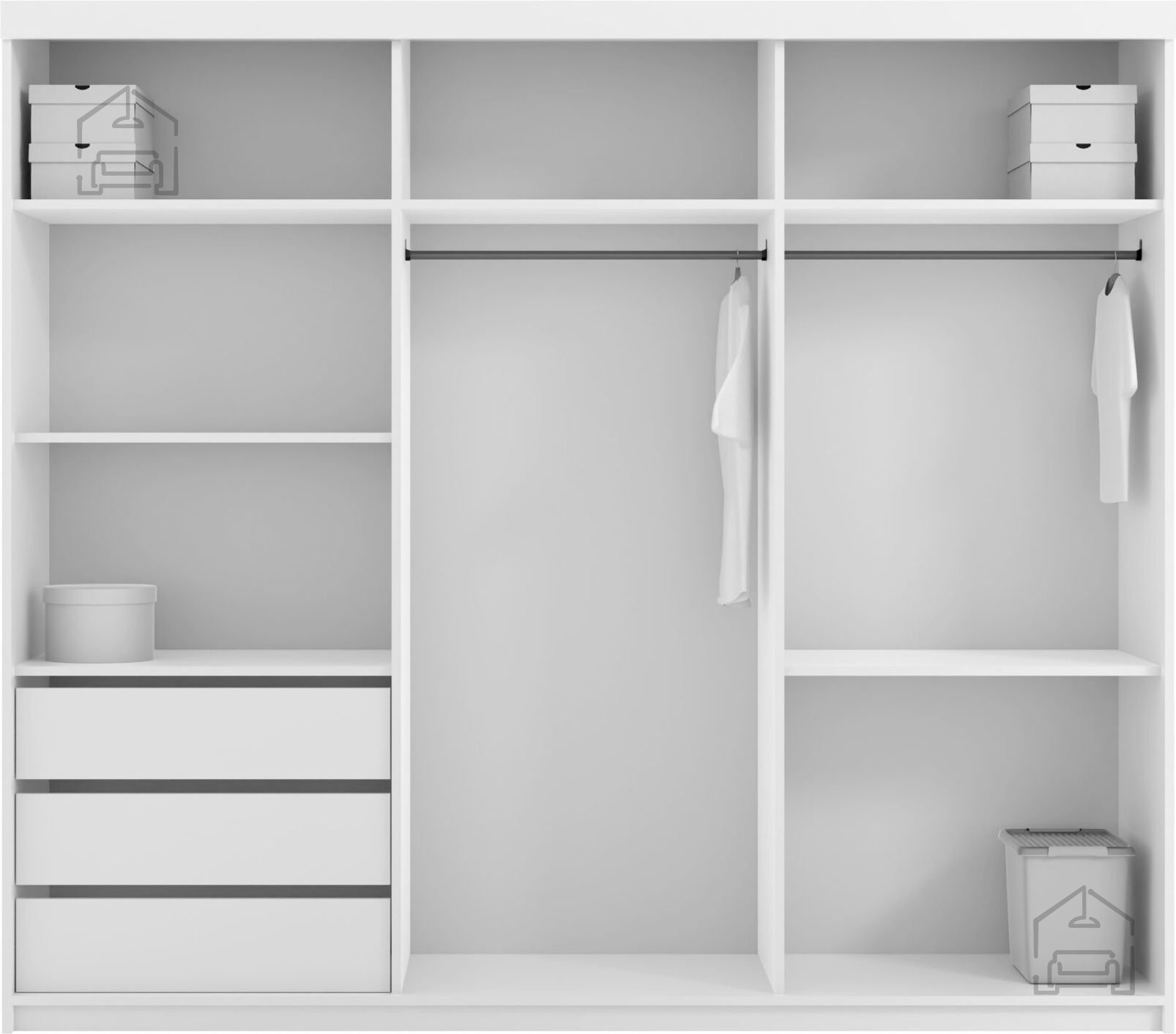 Der Kleiderschrank Lux 250 cm in elegantem Weiß ist die perfekte Wahl für alle, die eine Kombination aus Funktionalität und modernem Design suchen. Hergestellt aus hochwertiger Spanplatte und mit einem Spiegel ausgestattet, verleiht dieser Schrank Ihrem Schlafzimmer oder Flur nicht nur einen Hauch von Prestige, sondern nutzt den Raum auch praktisch aus und sorgt so für eine optimale Organisation Ihrer Kleidung und Accessoires.