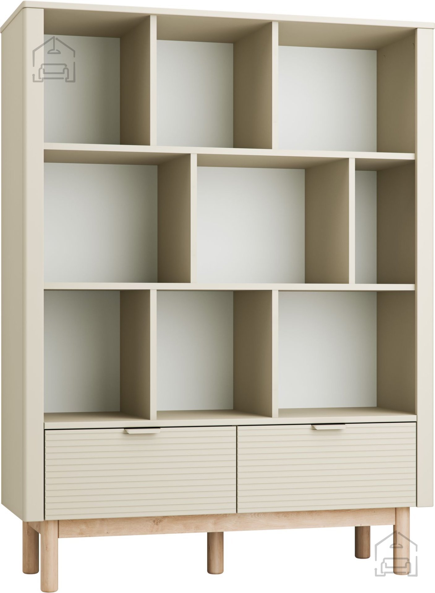 Das Design des Bücherregals Miloo überzeugt durch Details: gerillte Frontseiten verleihen Charakter und Raffinesse, während sanft abgerundete Ecken Sicherheit bieten – besonders wichtig für Haushalte mit jüngeren Nutzern. Ästhetisch gestaltete Metallgriffe und Holzbeine aus Buche verleihen dem Möbelstück Leichtigkeit und Finesse, wodurch es sich perfekt in jedes moderne Zuhause einfügt.
