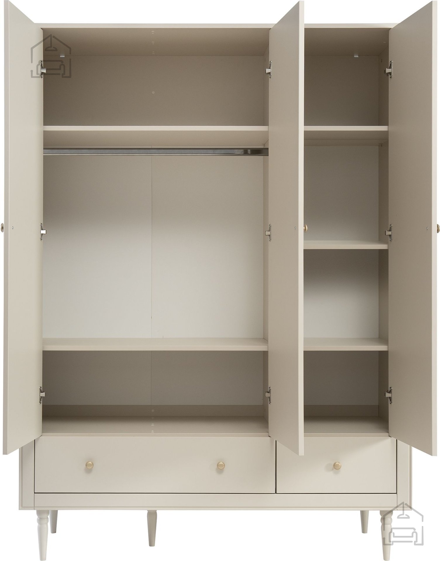 Der Schrank verfügt über drei großzügige Regalböden und eine Schublade mit hochwertigen Führungsschienen, die ein sanftes und selbstschließendes Funktionieren ermöglichen. Dieses durchdachte Design erlaubt die optimale Organisation Ihrer Kleidung, Schuhe und Accessoires. Metallgriffe in gedämpftem Goldton verleihen zusätzlich einen Hauch von Luxus.