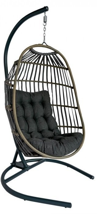 Massive Konstruktion aus pulverbeschichtetem Stahl und raffinierte Form aus Polyrattan: Hängender Gartensessel Kari – Mirpol. Dieser moderne Hängesessel in elegantem Schwarz vereint Haltbarkeit, Ästhetik und Komfort und ist daher die perfekte Wahl zum Entspannen auf der Terrasse, dem Balkon oder im Garten. Seine Konstruktion aus hochwertigen Materialien gewährleistet Stabilität, Witterungsbeständigkeit und eine lange Lebensdauer, während die durchdachte Kokonform des Korbes ein Gefühl von Privatsphäre und Geborgenheit schafft. Der Sitz, ergänzt durch einen weichen Stoff und bequeme Kissen, ermöglicht es Ihnen, sich nach einem anstrengenden Tag vollständig in sanftem Schaukeln zu entspannen.
