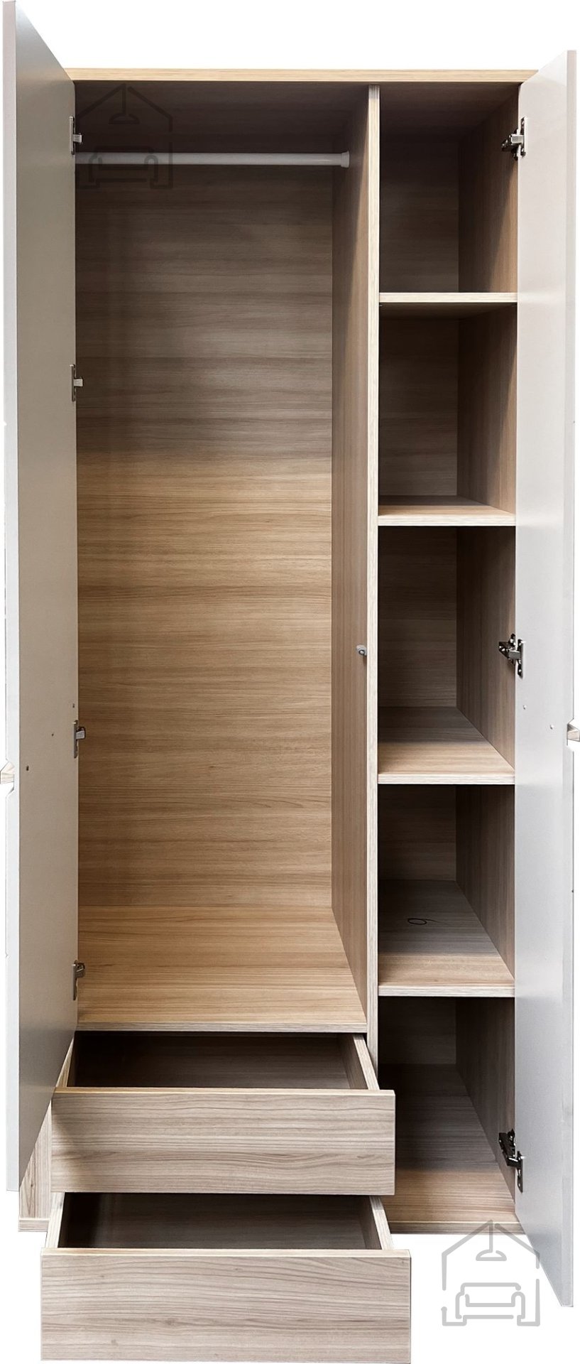 Mit den Maßen 78x55x200 cm ist der Schrank Wien OS/1 für maximale Funktionalität und Geräumigkeit optimiert, ohne dabei zu viel Platz in Ihrem Zimmer einzunehmen. Das Innere ist clever unterteilt, was eine einfache Aufbewahrung und den Zugang zu Ihrer Kleidung, Ihren Accessoires und anderen Notwendigkeiten ermöglicht. Der Schrank enthält mehrere Regale und ausreichend Platz zum Aufhängen, was die Organisation erleichtert und sicherstellt, dass Ihre Kleidung immer griffbereit und in perfektem Zustand ist.
