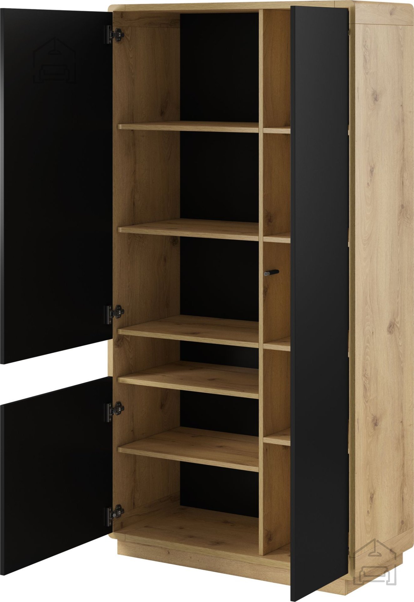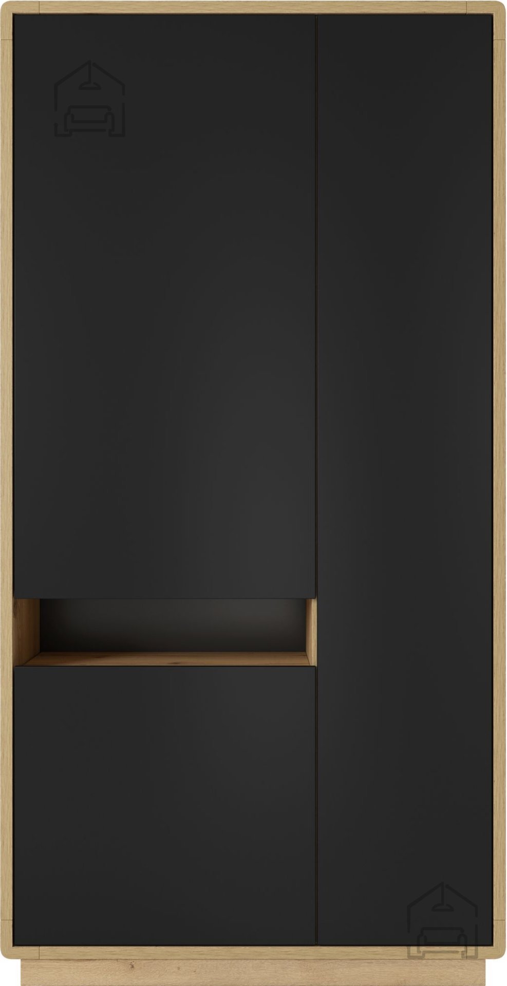 Der Schrank ist aus hochwertiger Spanplatte gefertigt, die Langlebigkeit und Beständigkeit garantiert. Die Farbkombination aus Taurus-Eiche und schwarzem Supermatt verleiht einen Hauch moderner Eleganz, die sich problemlos mit verschiedenen Einrichtungsstilen kombinieren lässt. Die schwarze Supermatt-Oberfläche sorgt für einen edlen Look, der Aufmerksamkeit erregt und Ihrem Zuhause modernen Chic verleiht.