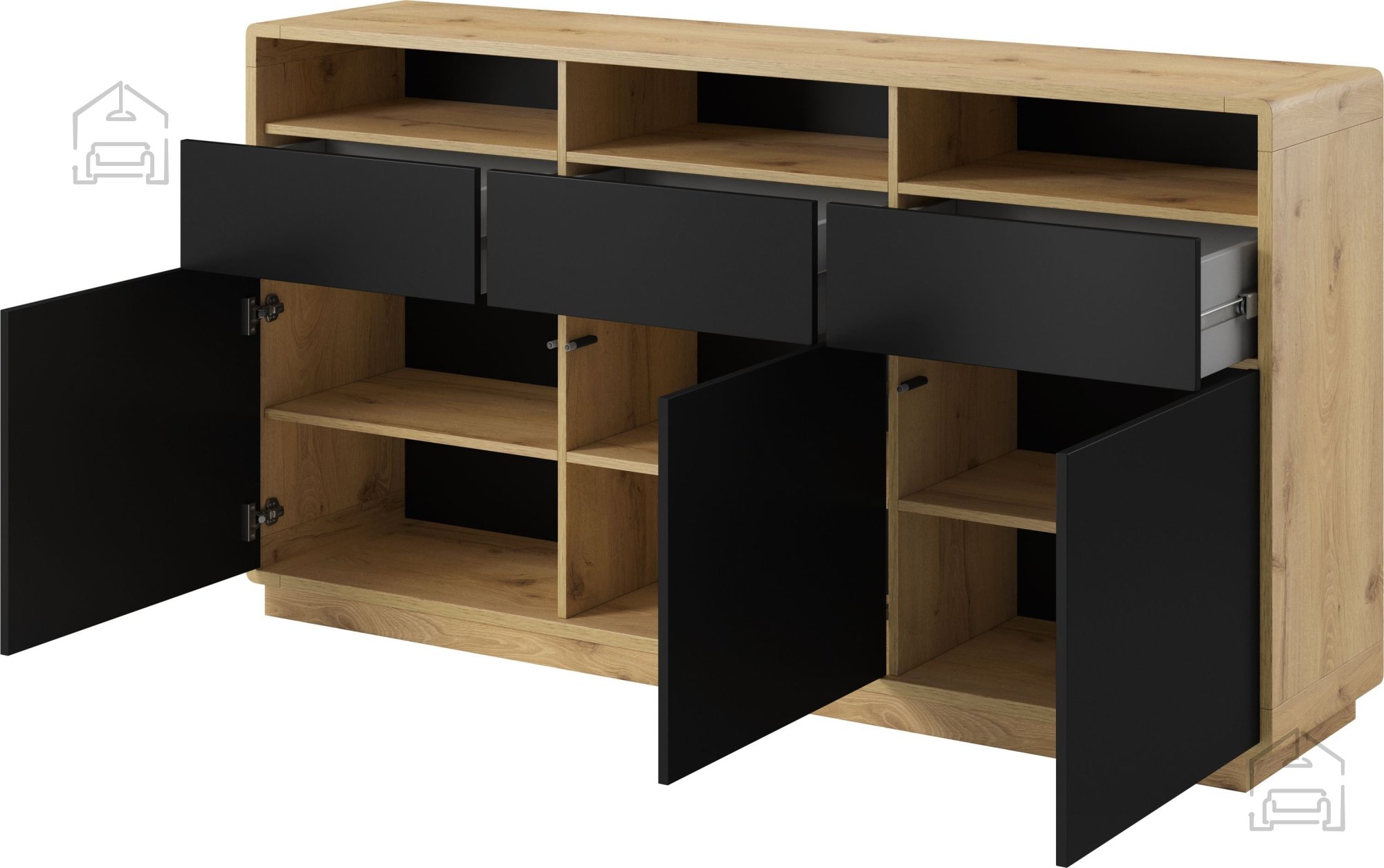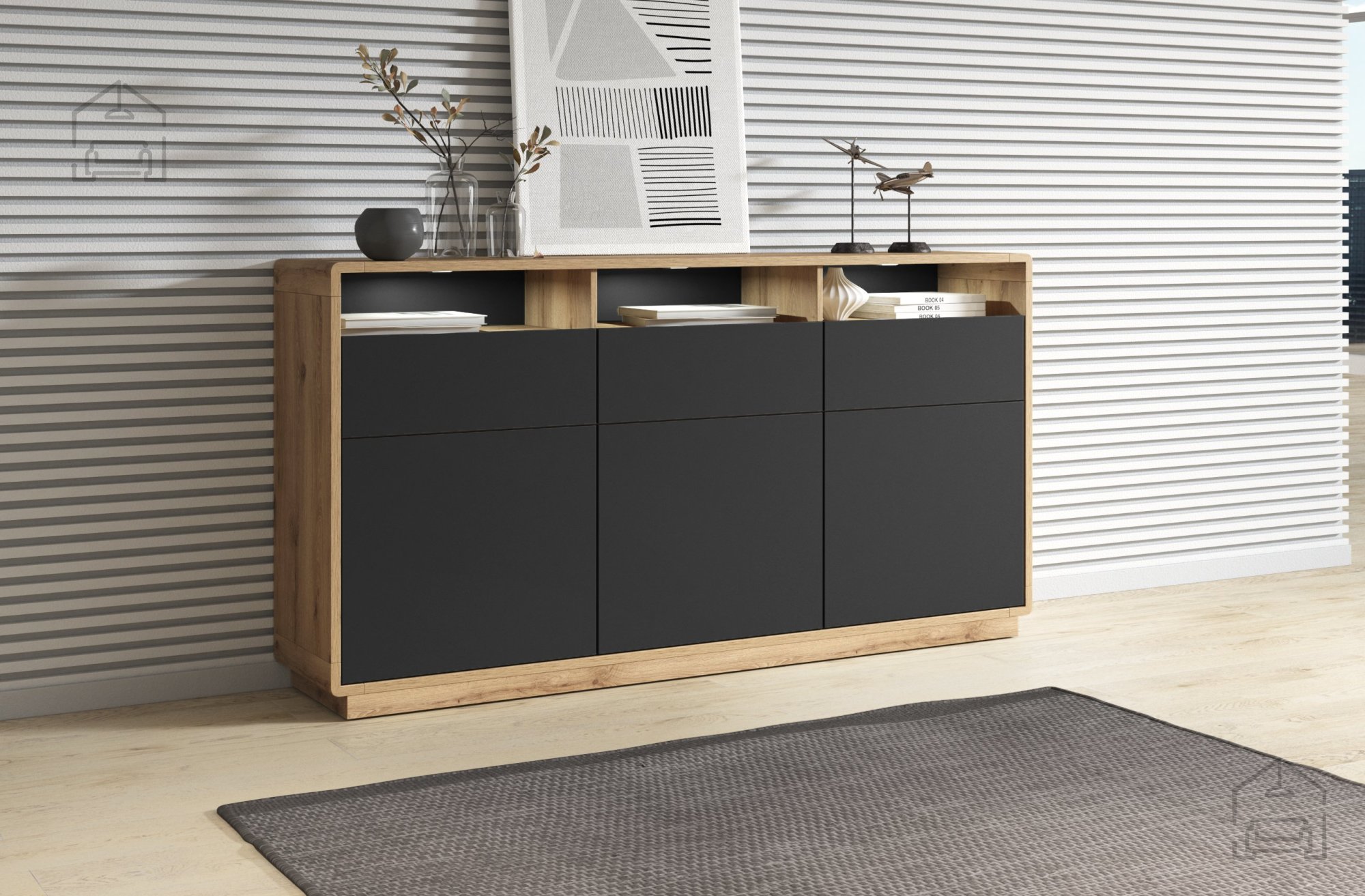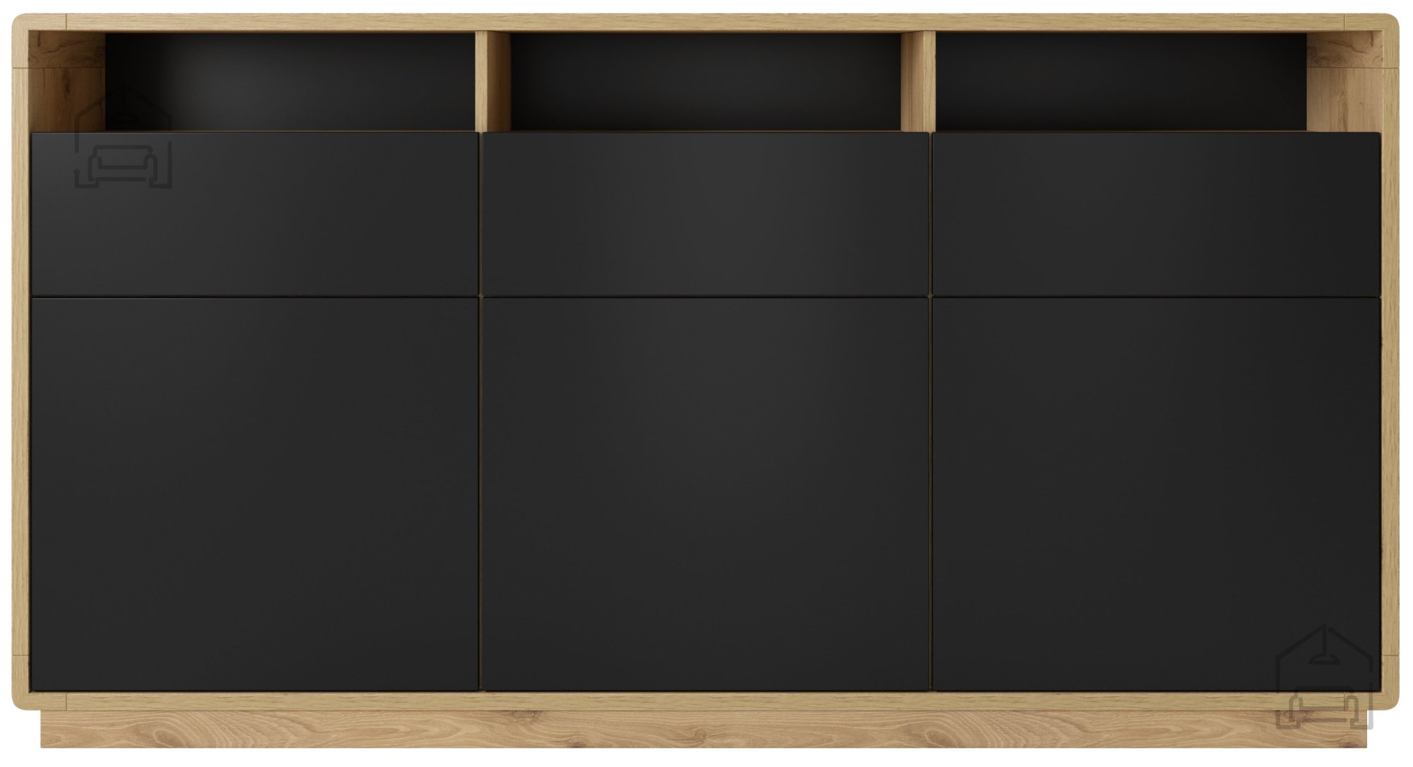 Die Kommode Aston 3D3S wurde sorgfältig im Hinblick auf moderne Ästhetik und Nachhaltigkeit entworfen. Die Verwendung von hochwertigem Spanplattenmaterial garantiert Langlebigkeit, während die Kombination aus Taurus-Eiche und schwarzer Supermatt-Farbe einen anspruchsvollen und modernen Look verleiht.