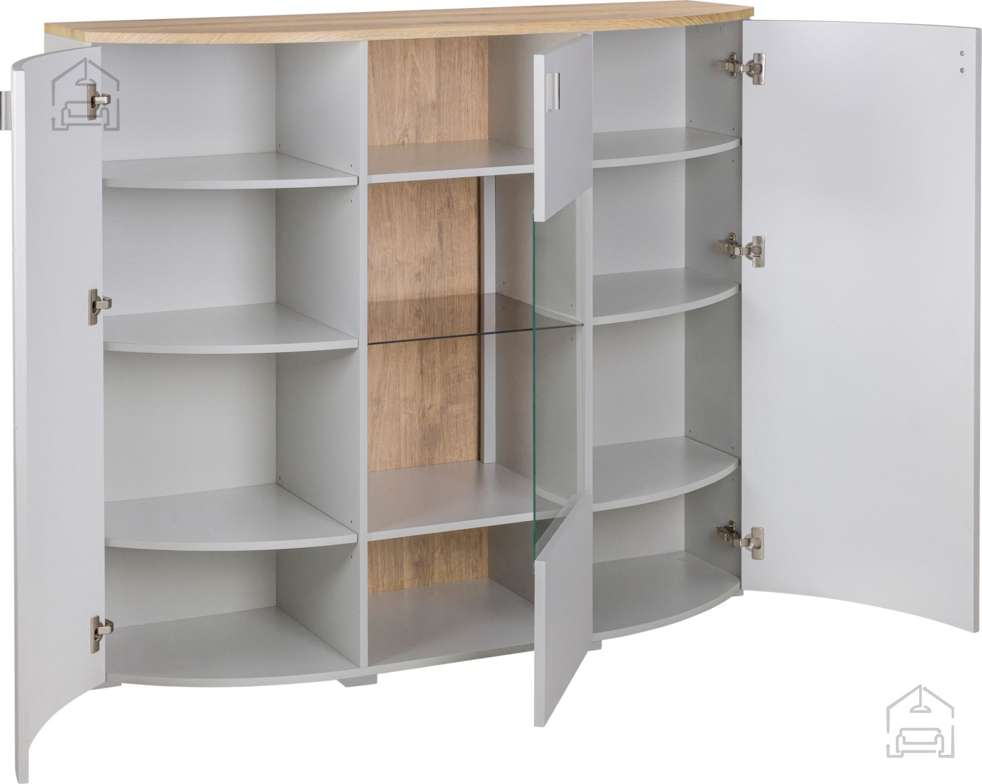 Mit den Maßen 135x44x119 cm bietet Ihnen die Vitrine ausreichend Platz zur Aufbewahrung und Präsentation Ihrer Lieblingsdekorationsstücke, Bücher oder Geschirr. Drei geräumige Regalböden ermöglichen es Ihnen, Ihren Raum nach Ihren eigenen Vorstellungen zu organisieren. Die Vitrine Sambuca 3D ist ideal für Wohnzimmer, Esszimmer oder Büros, wo Funktionalität auf Ästhetik trifft.