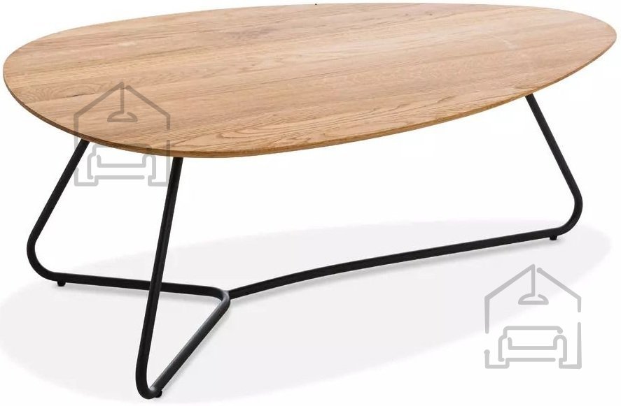 Unter der Tischplatte befindet sich ein Metallgestell mit schwarzer Pulverbeschichtung, das Stabilität und ein modernes Erscheinungsbild gewährleistet. Drei Metallbeine, verbunden durch eine geschwungene Tragstruktur, verleihen dem Tisch einen industriellen Touch, der einen spannenden Kontrast zu den warmen Eichentönen bildet. Diese Kombination sorgt für eine visuelle Attraktivität, die sowohl moderne als auch rustikale Innenräume perfekt ergänzt.