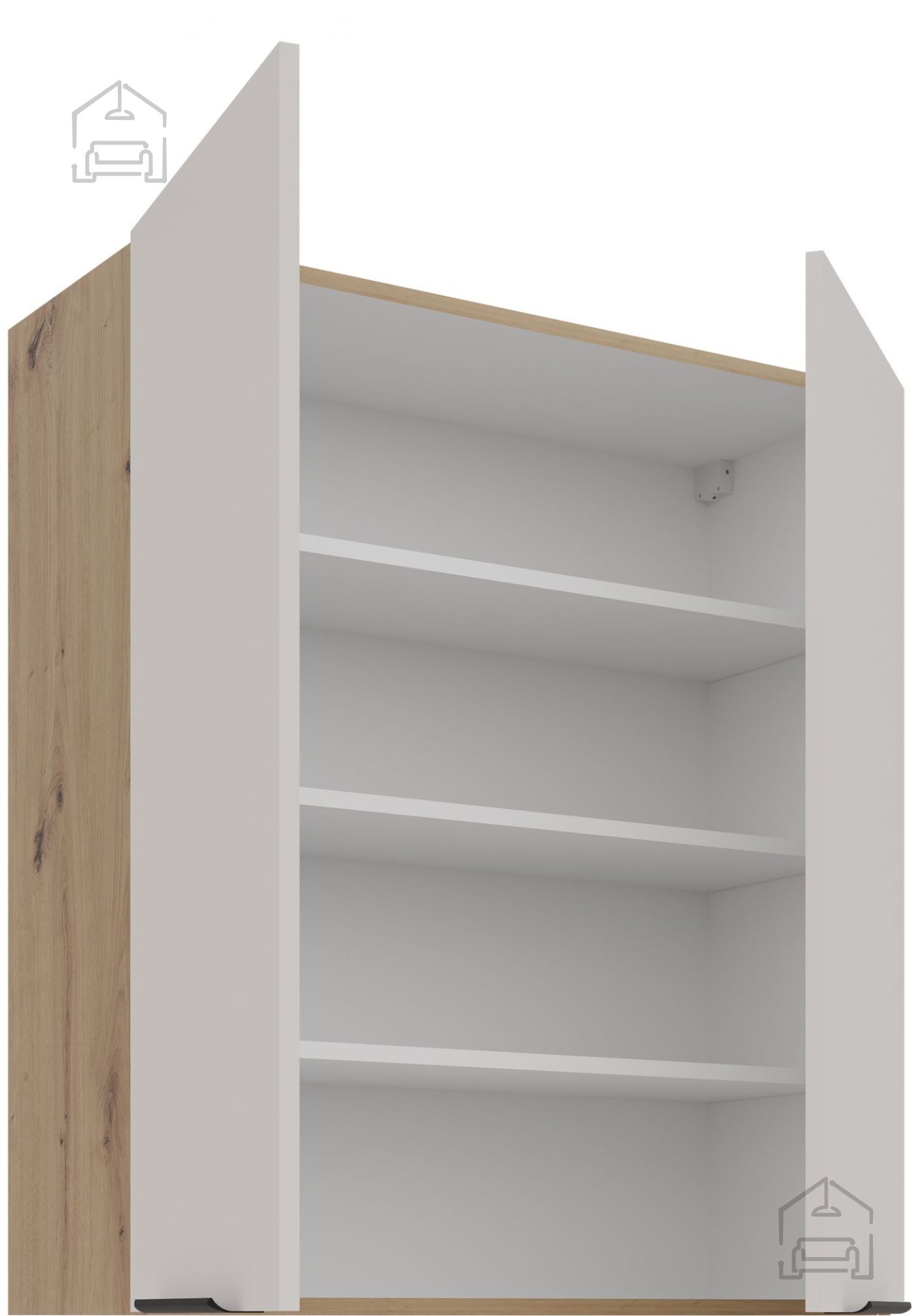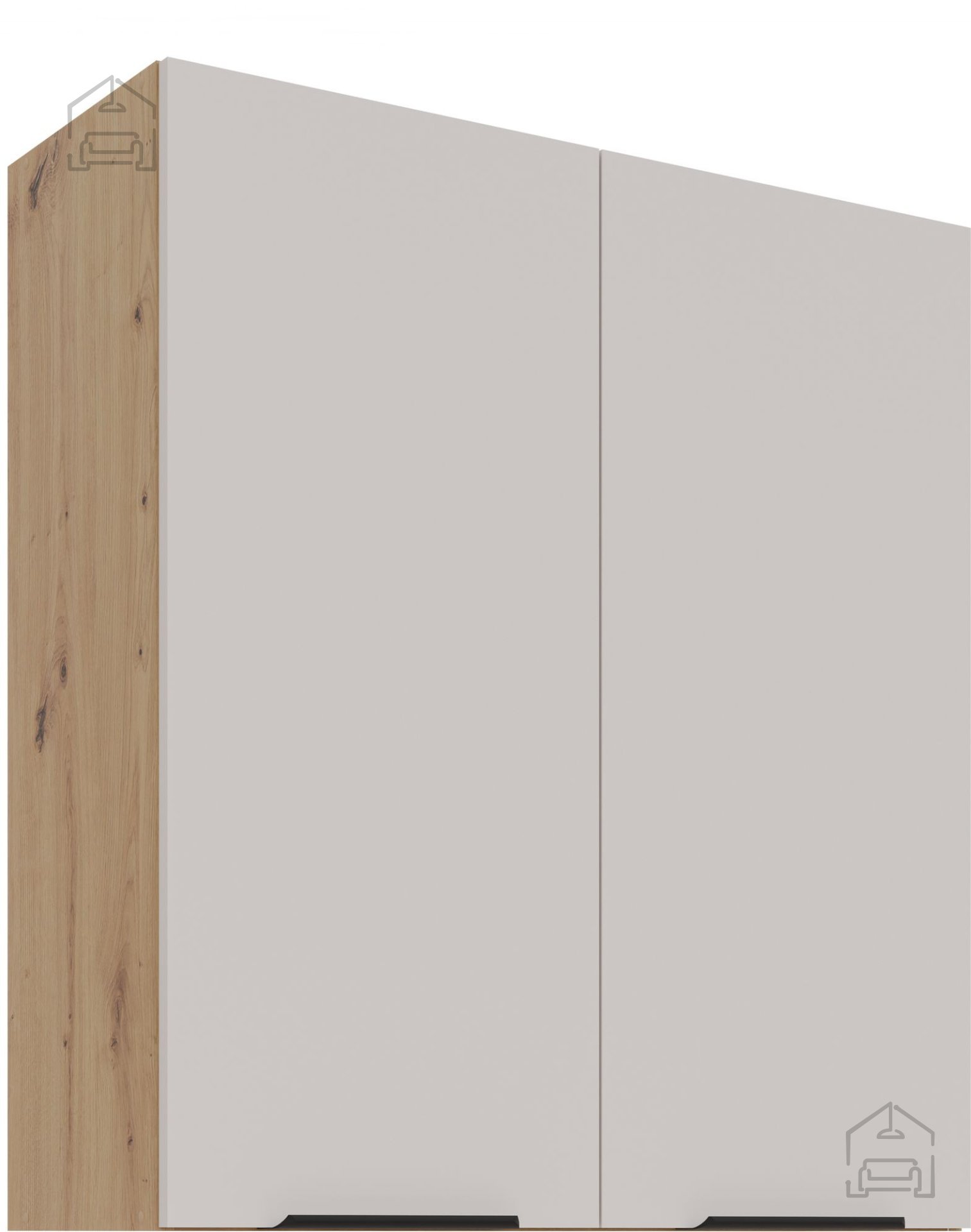 Die Küchenzeile Solea zeichnet sich durch hochwertige Materialien und ein durchdachtes Farbschema aus. Der Rahmen aus 16 mm starker laminierter Platte sorgt für Haltbarkeit und langfristige Nutzung, während die Farbe des Korpus im Farbton Eiche Artisan einen Hauch natürlicher Wärme verleiht. Die Front in elegantem Kaschmir sorgt für ein raffiniertes Aussehen, das sich hervorragend mit modernen oder klassischen Dekorationselementen Ihres Zuhauses verbindet.