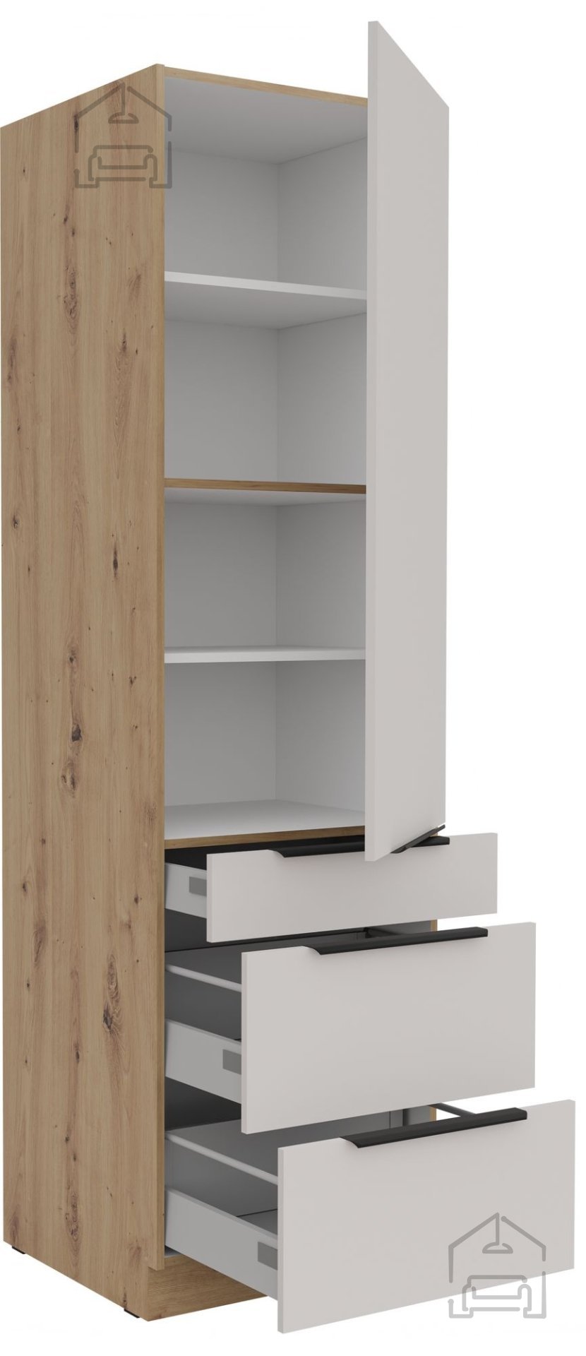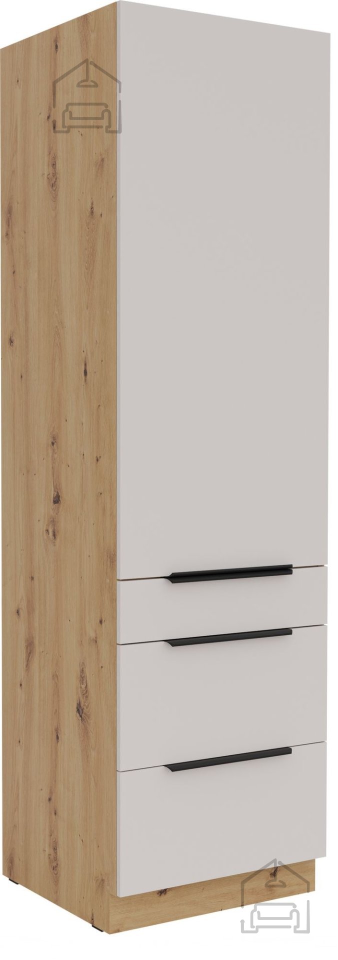 Die Küchenzeile Solea zeichnet sich durch hochwertige Materialien und ein durchdachtes Farbschema aus. Der Rahmen aus 16 mm starker laminierter Platte sorgt für Haltbarkeit und Langlebigkeit, während die Korpusfarbe im Farbton Eiche Artisan einen Hauch natürlicher Wärme verleiht. Die Front in elegantem Kaschmir sorgt für ein anspruchsvolles Aussehen, das sich perfekt mit modernen oder klassischen dekorativen Elementen Ihres Zuhauses verbindet.