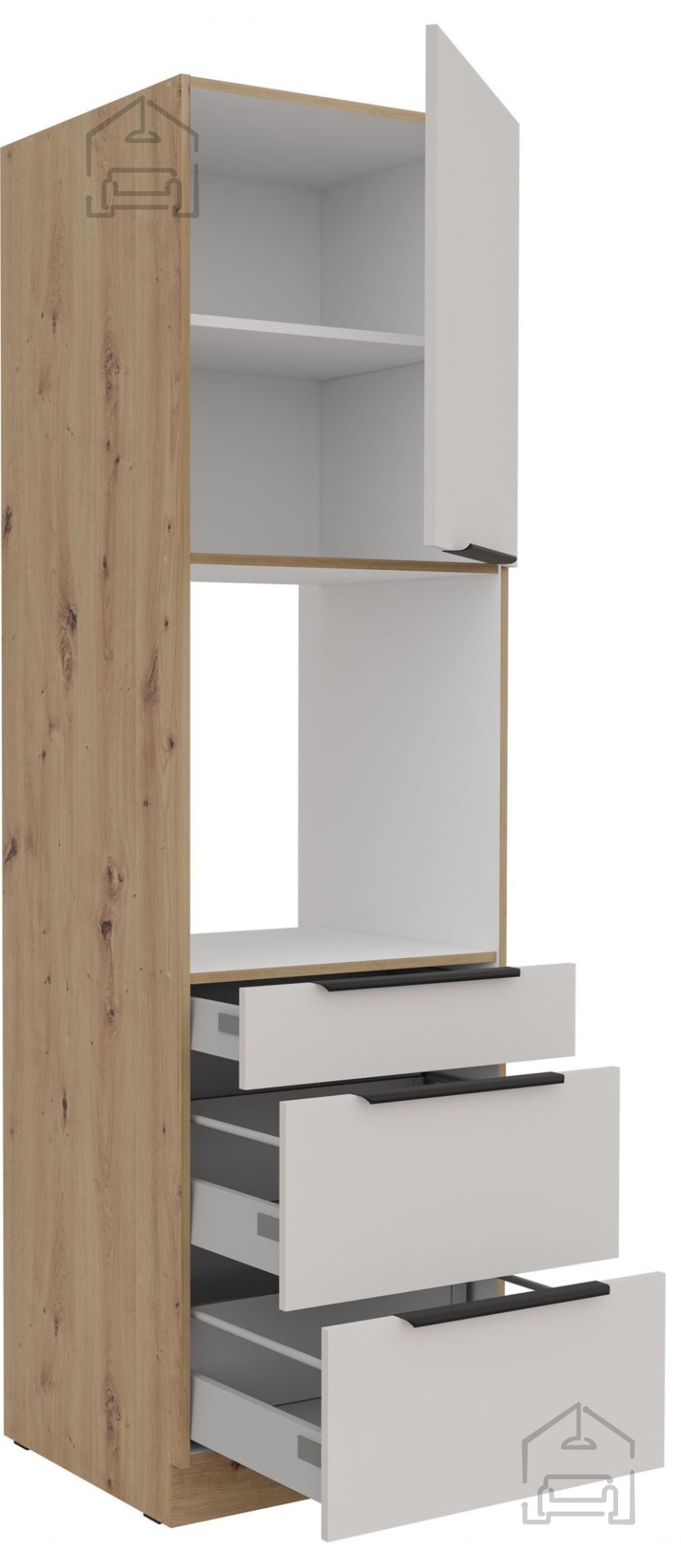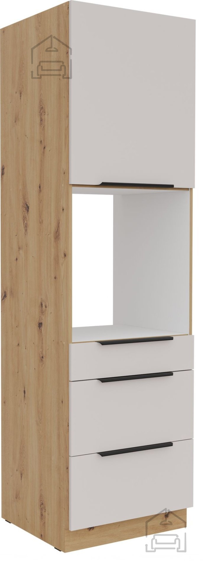 Die Küchenzeile Solea zeichnet sich durch hochwertige Materialien und ein durchdachtes Farbschema aus. Der Rahmen aus 16 mm starker laminierter Platte sorgt für Haltbarkeit und Langlebigkeit, während die Korpusfarbe im Farbton Eiche Artisan einen Hauch natürlicher Wärme verleiht. Die Front in elegantem Kaschmir sorgt für ein anspruchsvolles Aussehen, das sich hervorragend mit modernen oder klassischen Dekorationselementen Ihres Hauses verbindet.