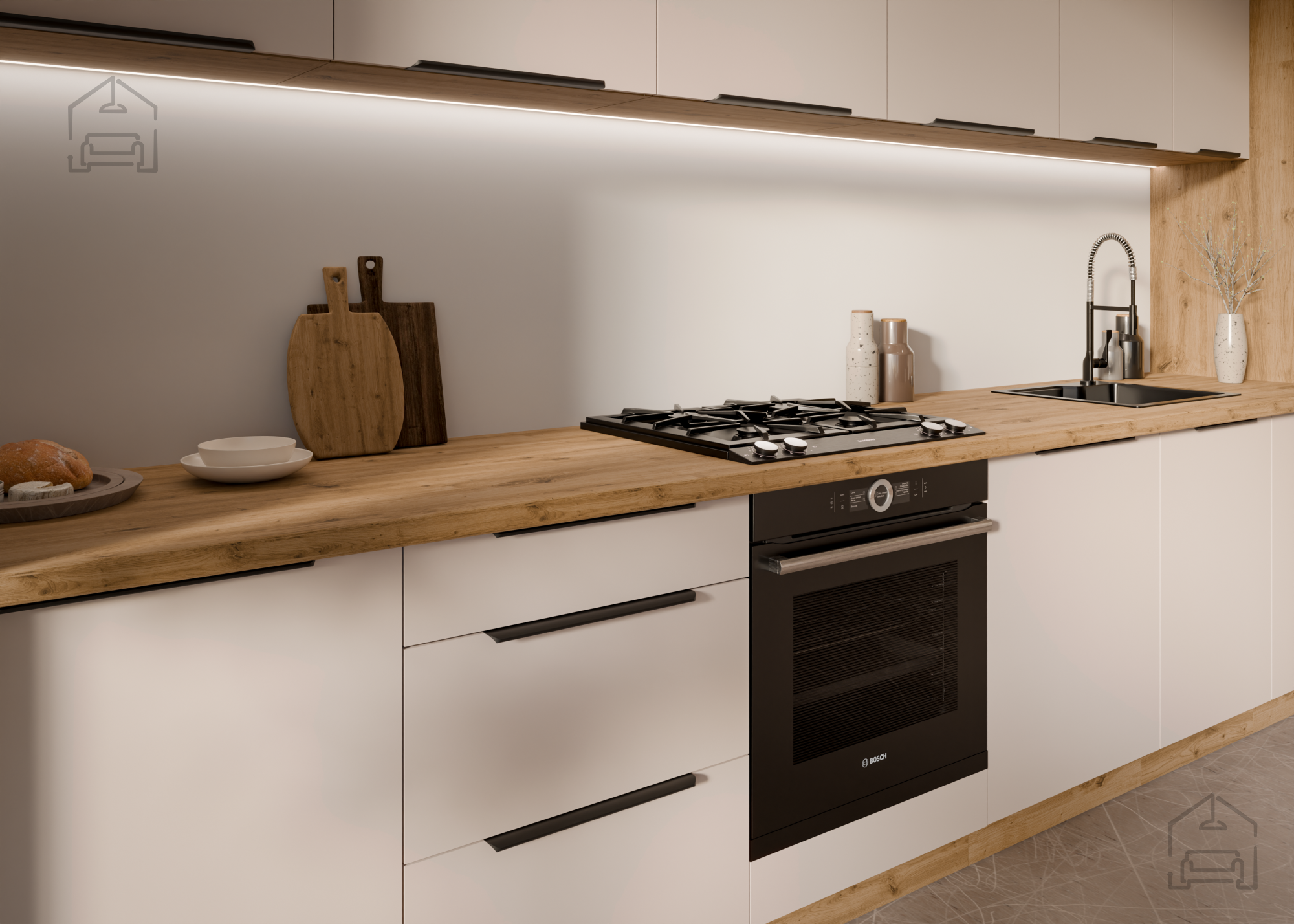 Die Küchenzeile Solea zeichnet sich durch hochwertige Materialien und ein durchdachtes Farbschema aus. Der Rahmen aus 16 mm starker laminierter Platte sorgt für Haltbarkeit und langfristige Nutzung, während die Korpusfarbe im Farbton Artisan-Eiche einen Hauch natürlicher Wärme verleiht. Die Front in elegantem Kaschmir sorgt für ein anspruchsvolles Aussehen, das sich perfekt mit modernen oder klassischen dekorativen Elementen Ihres Hauses verbindet.