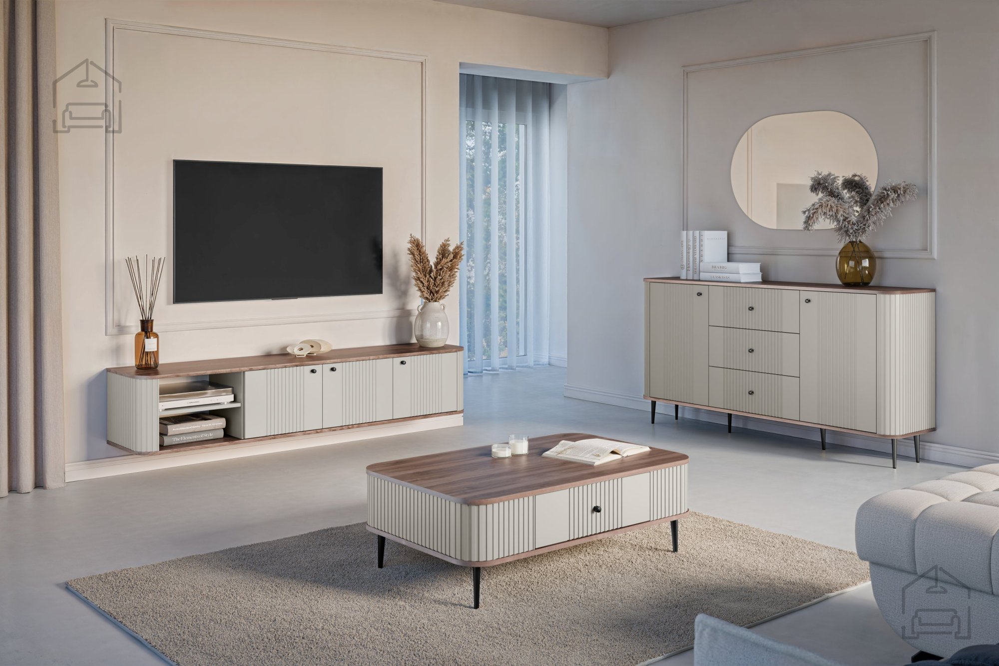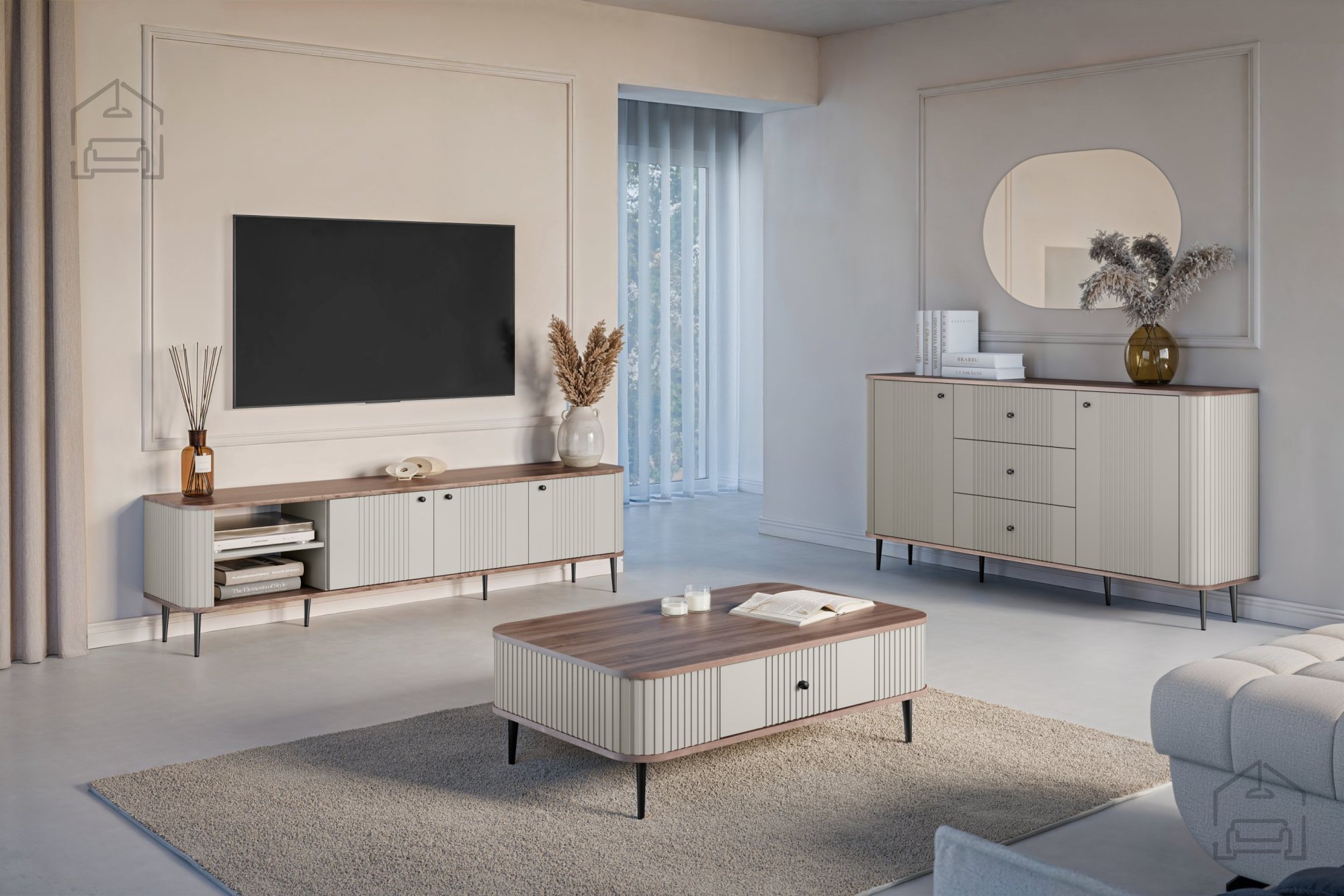 Raffiniertes Design: Mit seiner Kaschmirfarbe bringt der Couchtisch 100 Wärme und Raffinesse in jeden Raum. Die Kombination aus laminiertem Brett und MDF-Fronten mit PVC-Folie schafft ein elegantes und modernes Aussehen, das verschiedene Einrichtungsstile ergänzt.