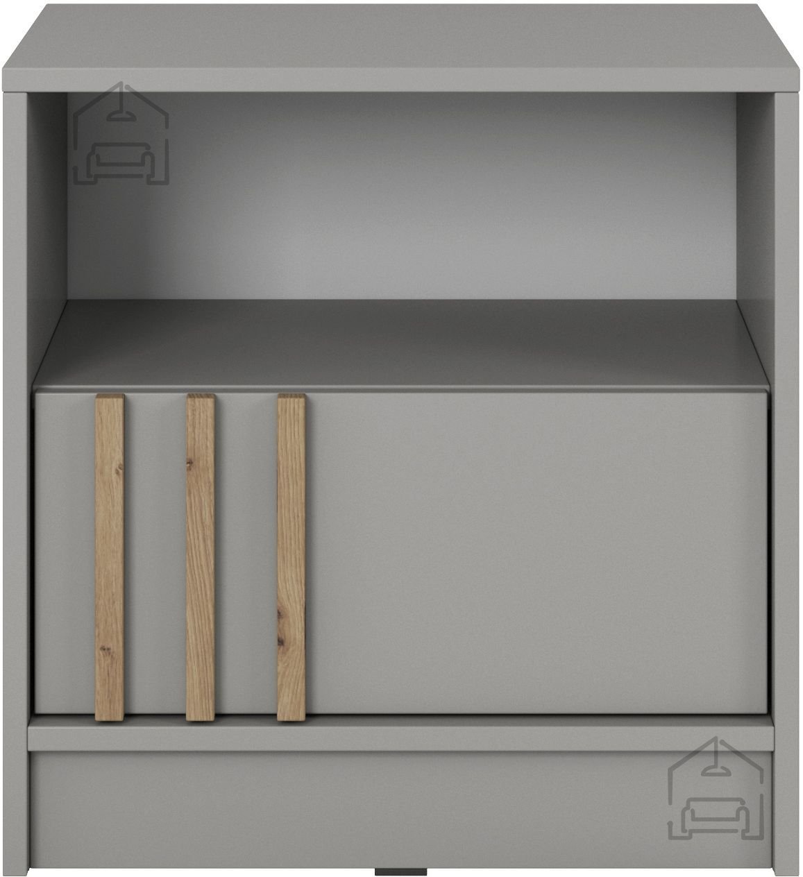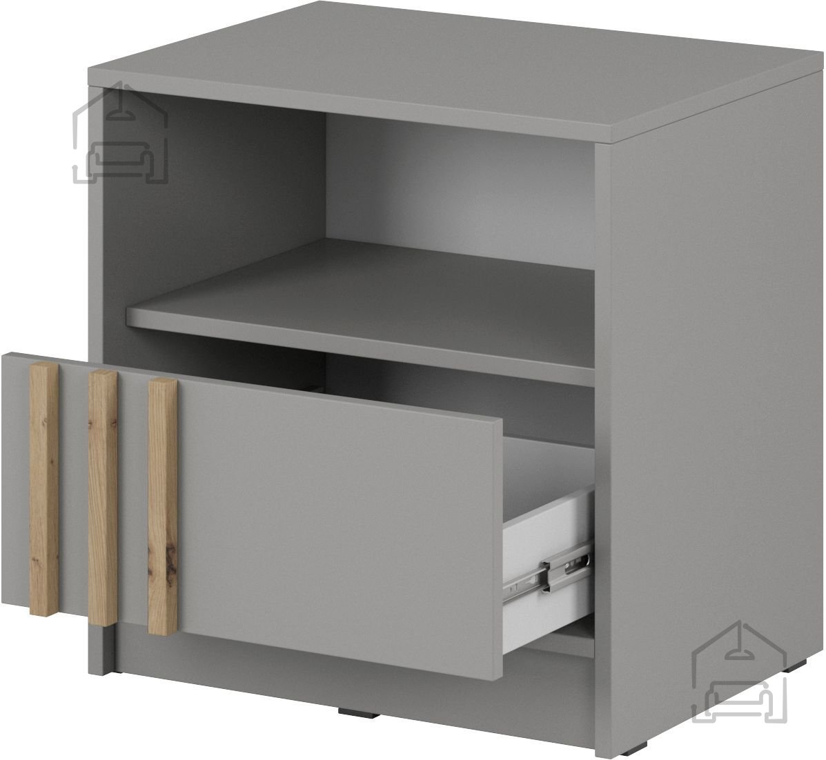 Wir präsentieren Ihnen den Nachttisch Nelly, der Eleganz und Funktionalität in einem einzigen Produkt vereint. Mit seinem modernen Design in der Farbkombination Grau und Eichenholz Artisan wird dieser Nachttisch zu einem unverzichtbaren Teil Ihres Schlafzimmers. Hergestellt in der renommierten Fabrik Piaski in Polen, garantiert er die Qualität und Langlebigkeit, die Sie suchen.
