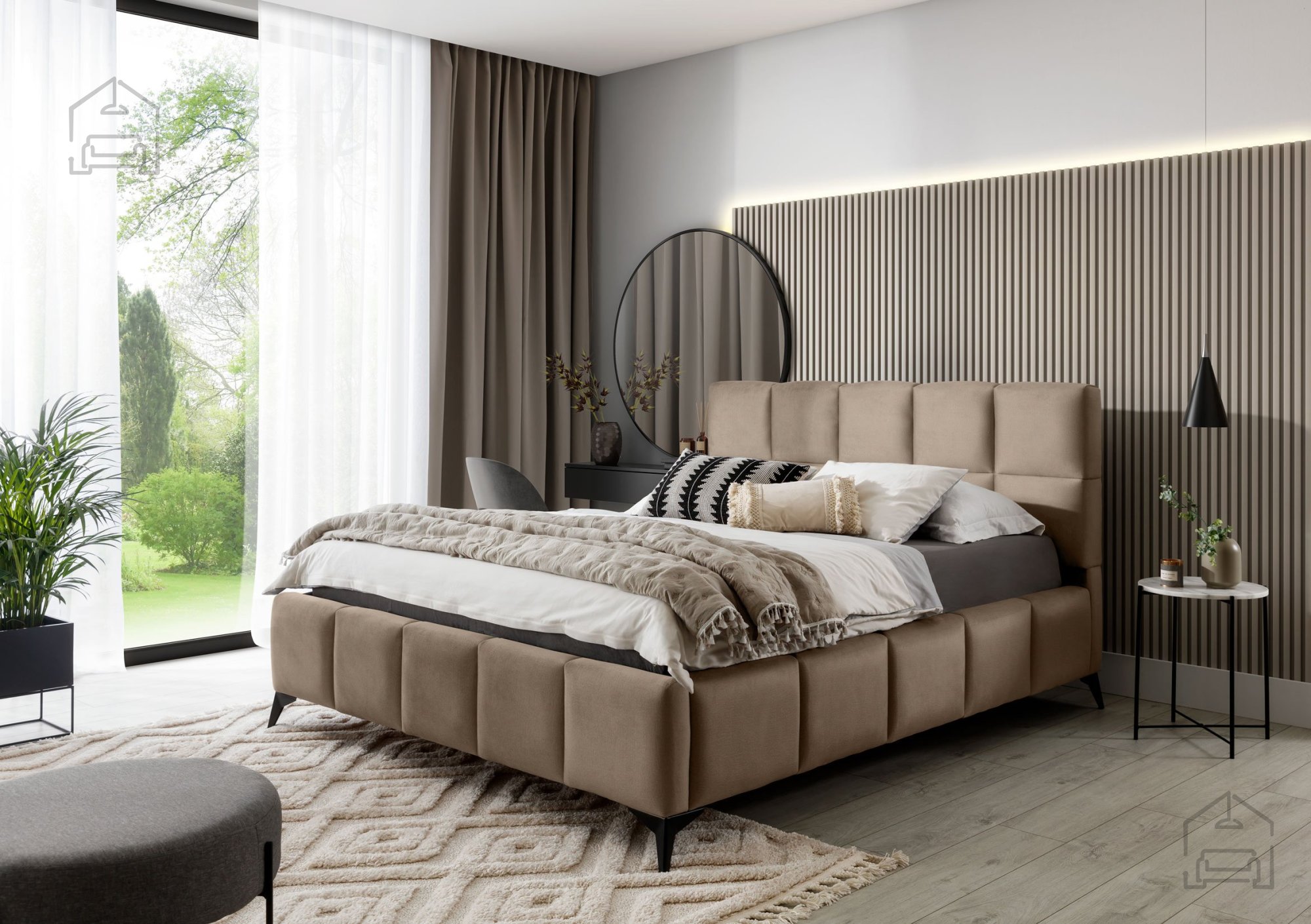 Gefertigt aus hochwertigem Holz und Kiefer, vereint das Bett Mist Robustheit und Langlebigkeit mit modernem Design. Seine gepolsterte Form mit einem eleganten Kopfteil, das mit weichem Schaumstoff gefüllt ist, garantiert nicht nur höchsten Komfort, sondern auch eine ästhetische Attraktivität, die zum Mittelpunkt Ihres Schlafzimmers wird. Elegante Steppnähte verleihen einen modernen Touch, während die schwarzen Stahlfüße den Eindruck von Schweben erzeugen und den Raum optisch vergrößern.