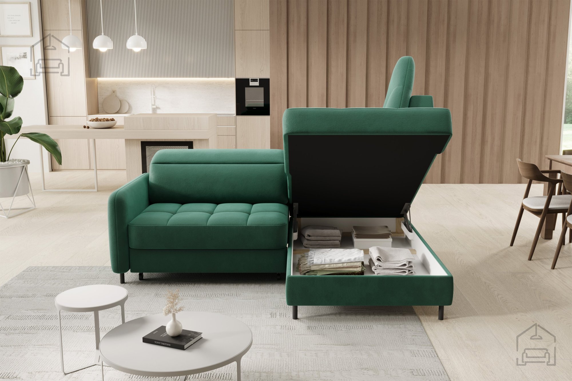 Flexibilität und Funktionalität: Der Dolphin-Mechanismus ermöglicht eine einfache Umwandlung des Sofas in ein bequemes Bett mit den Maßen 160x128 cm – ideal für Gäste oder Familienmitglieder, die über Nacht bleiben. Zusätzlich verfügt das Sofa über einen Bettkasten, der zusätzlichen Stauraum bietet und somit für Ordnung im Raum sorgt.