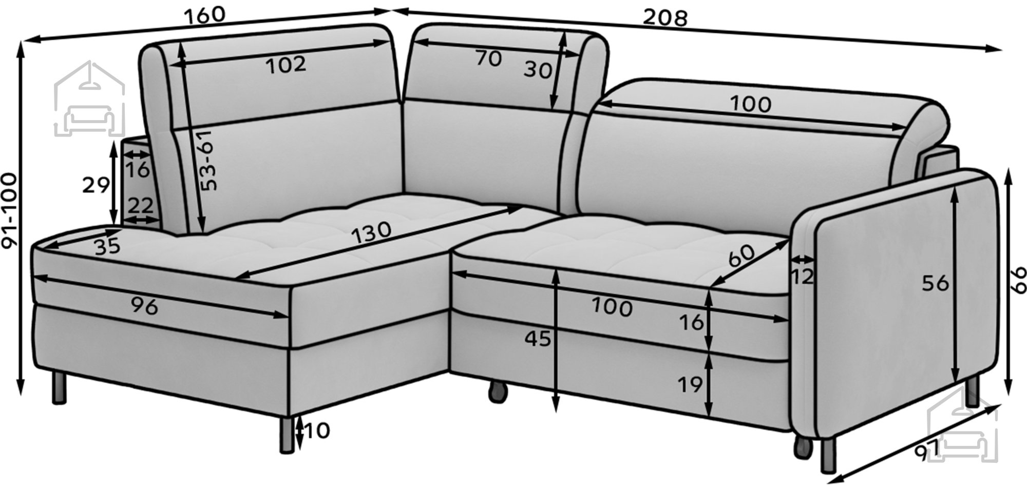 Hinweis: Die bei der Herstellung der Sofas und Sitzgarnituren verwendeten Materialien umfassen verschiedene Arten von Polyurethanschaum, Vliesstoff, Viscolatex usw. Diese Produkte weisen einen hohen Kompressions- und Elastizitätskoeffizienten auf, daher behält sich der Hersteller das Recht auf eine negative und positive Toleranz von +/- 2 % in Breite und Länge vor.