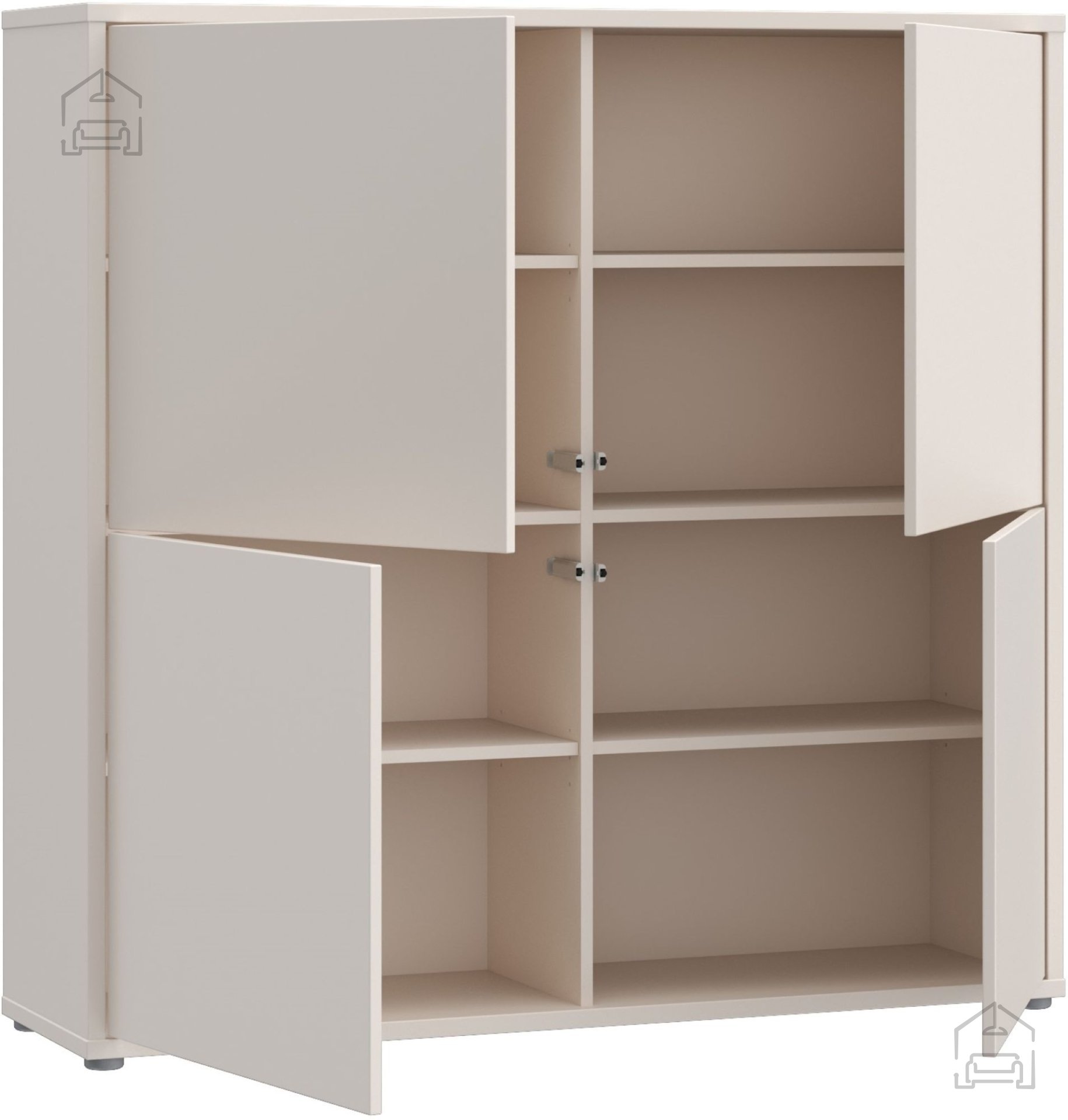 Die Kommode Wien 321 verfügt über vier Türen, die den Zugang zu zwei separaten Abteilen öffnen. Jedes Abteil ist zusätzlich mit einer vertikalen Trennwand und einem horizontalen Regal unterteilt, was insgesamt acht verschiedene Aufbewahrungsmöglichkeiten schafft. Dieses durchdachte Design ermöglicht es Ihnen, alles von Bürodokumenten, Büchern bis hin zu Besteck oder Kinderspielzeug einfach zu organisieren. Feste Regale, die bis zu 15 kg tragen, sorgen für Stabilität und Sicherheit Ihrer Gegenstände.