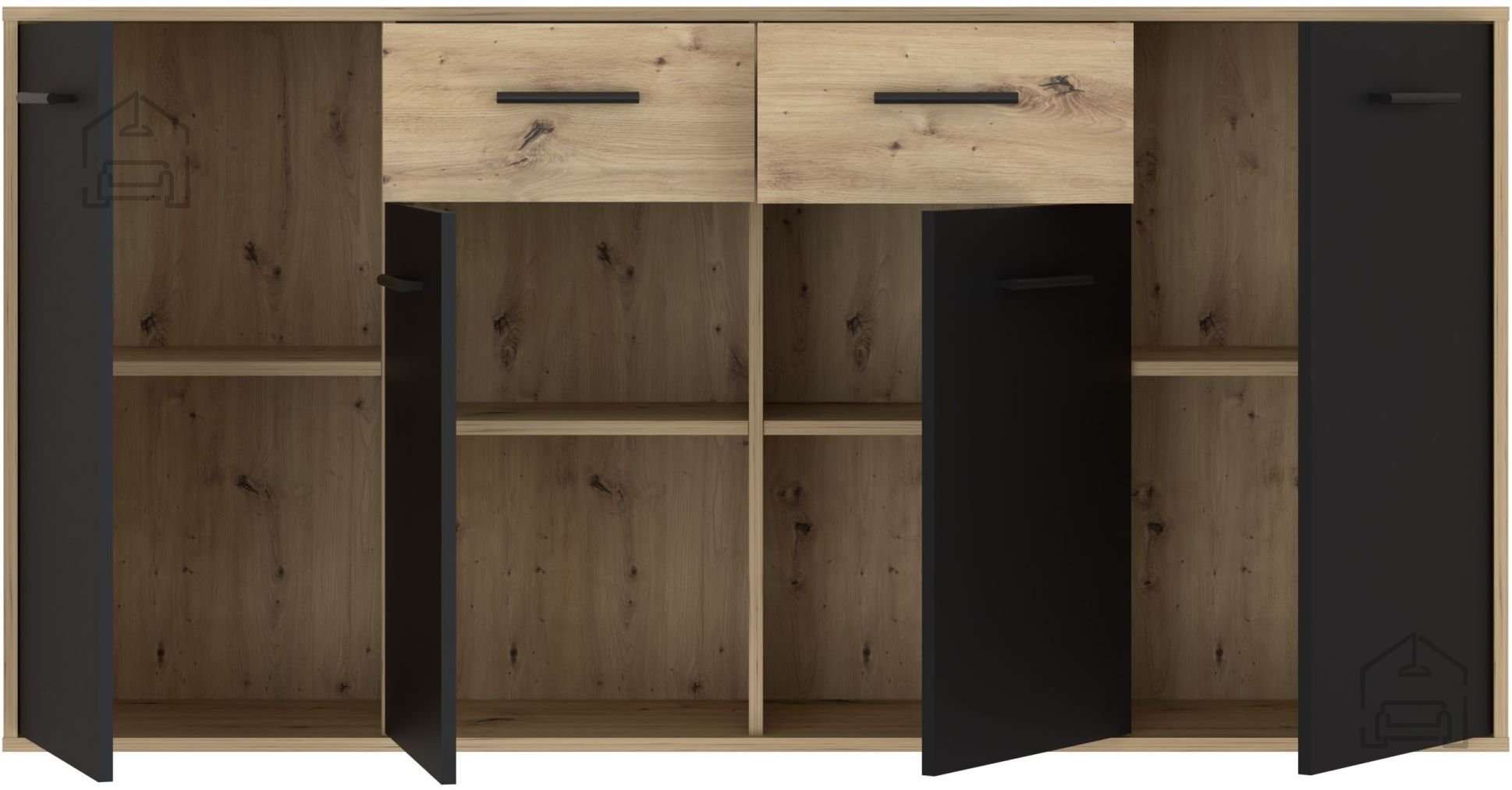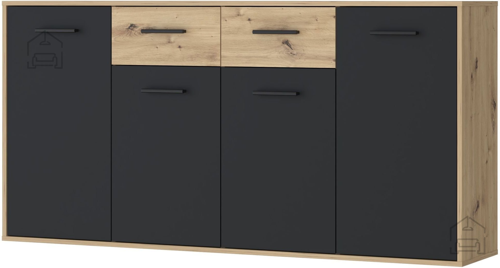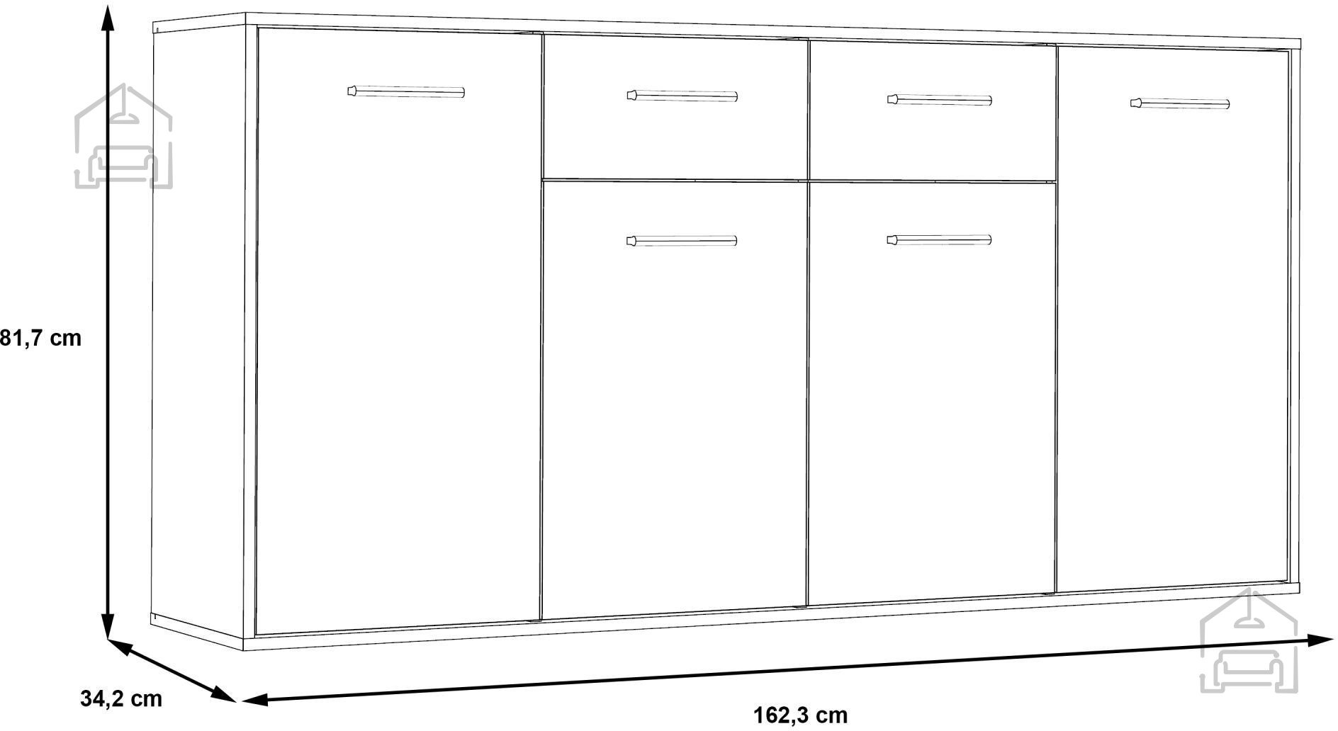 Die Kommode Antuza 241 bietet reichlich Stauraum mit zwei geräumigen Schubladen und vier Türen. Die Innenfächer, unterteilt durch Einlegeböden, ermöglichen Ordnung und Übersichtlichkeit Ihrer Gegenstände – sei es Besteck, Büromaterial oder andere Haushaltsutensilien. Mit einer Tragfähigkeit der oberen Platte von bis zu 40 kg können Sie bedenkenlos dekorative Elemente darauf platzieren, die Ihren Raum zusätzlich verschönern.
