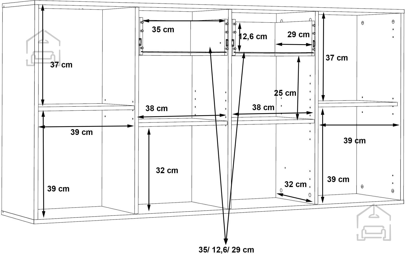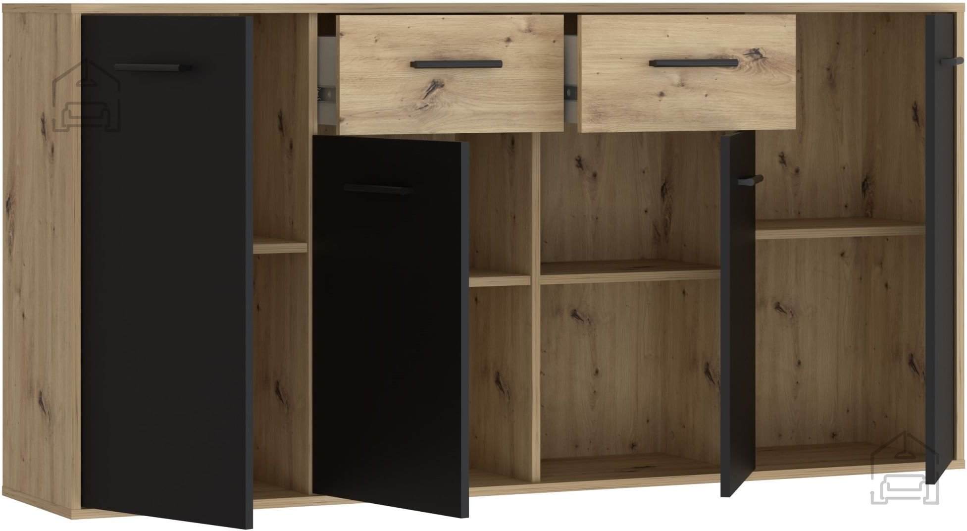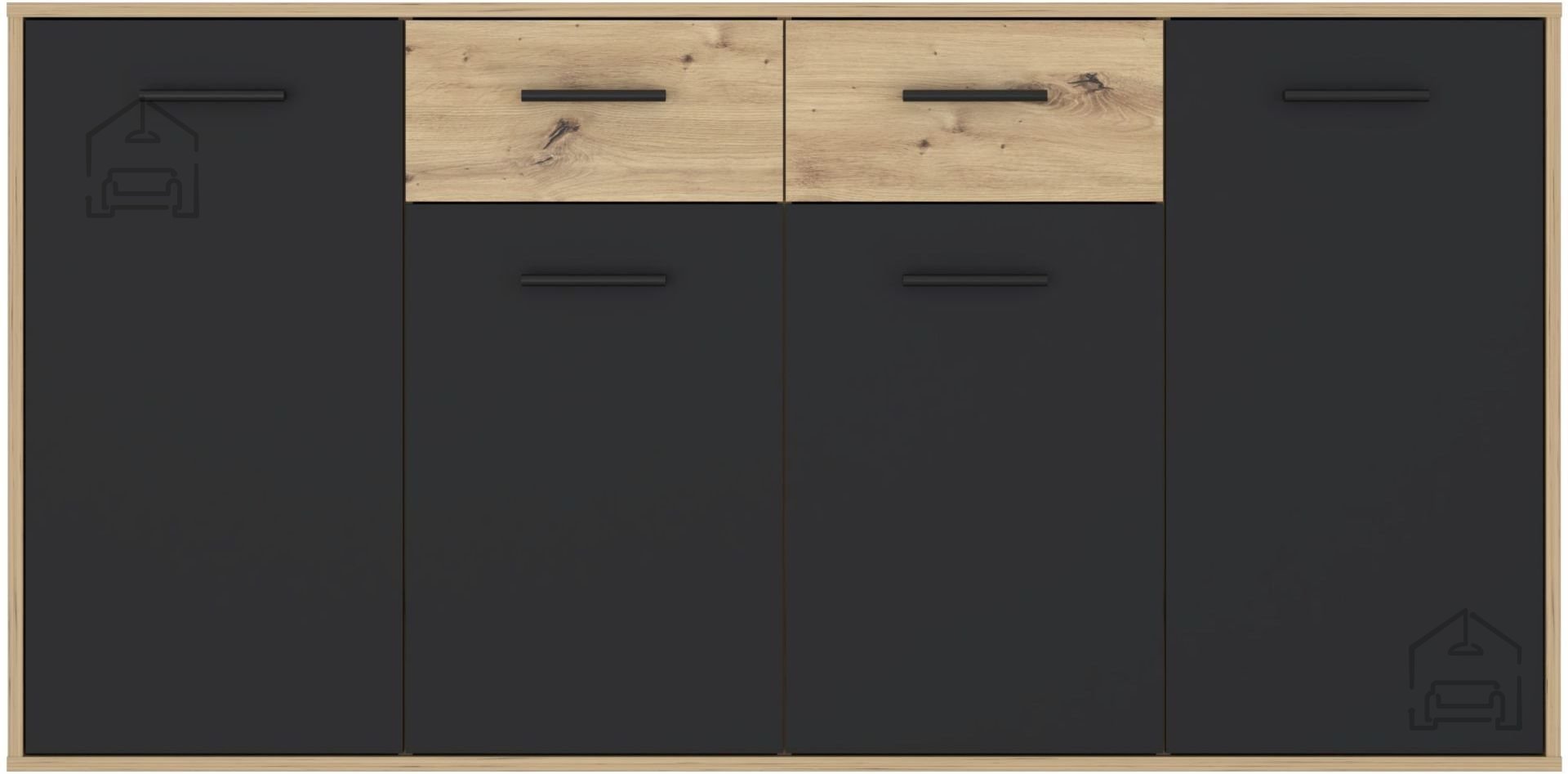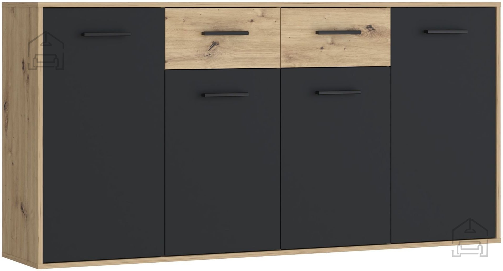 Die Kommode Antuza 241 bietet reichlich Stauraum mit zwei geräumigen Schubladen und vier Türen. Die Innenfächer, unterteilt durch Einlegeböden, ermöglichen Ordnung und Übersichtlichkeit Ihrer Gegenstände – sei es Besteck, Büromaterial oder andere Haushaltsutensilien. Mit einer Tragfähigkeit der oberen Platte von bis zu 40 kg können Sie bedenkenlos dekorative Elemente darauf platzieren, die Ihren Raum zusätzlich verschönern.