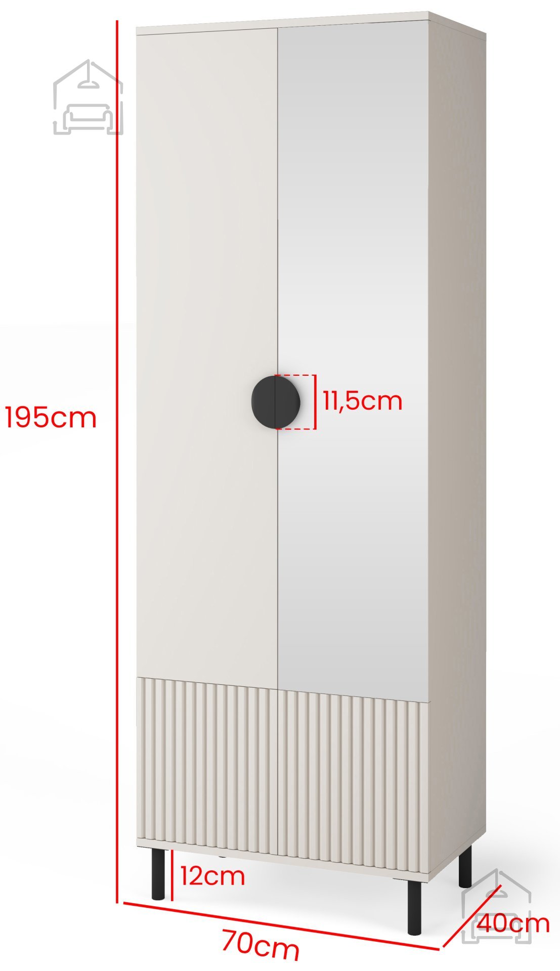 Die 12 cm hohen Metallfüße sorgen für Stabilität und Robustheit, sodass der Schrank eine maximale Belastung von bis zu 200 kg tragen kann. Dieses Merkmal ist entscheidend für eine langfristige Nutzung und Zuverlässigkeit, was bedeutet, dass Sie darin auch größere Kleidungsstücke oder schwerere Gegenstände sicher aufbewahren können. Der Kleiderschrank Rayo ist benutzerorientiert gestaltet, da die hohe Beinkonstruktion eine leichtere Reinigung des Bodens unter dem Schrank ermöglicht.