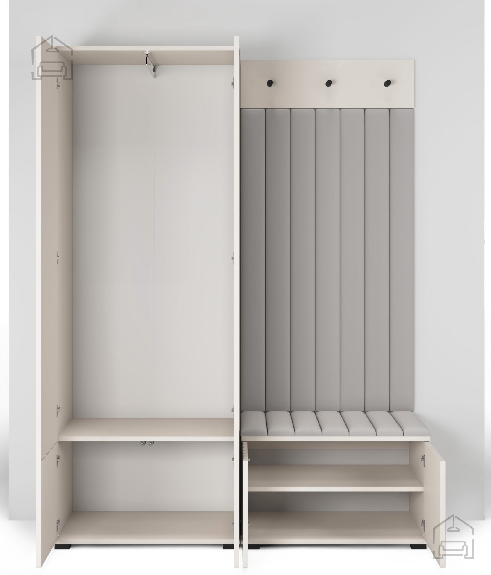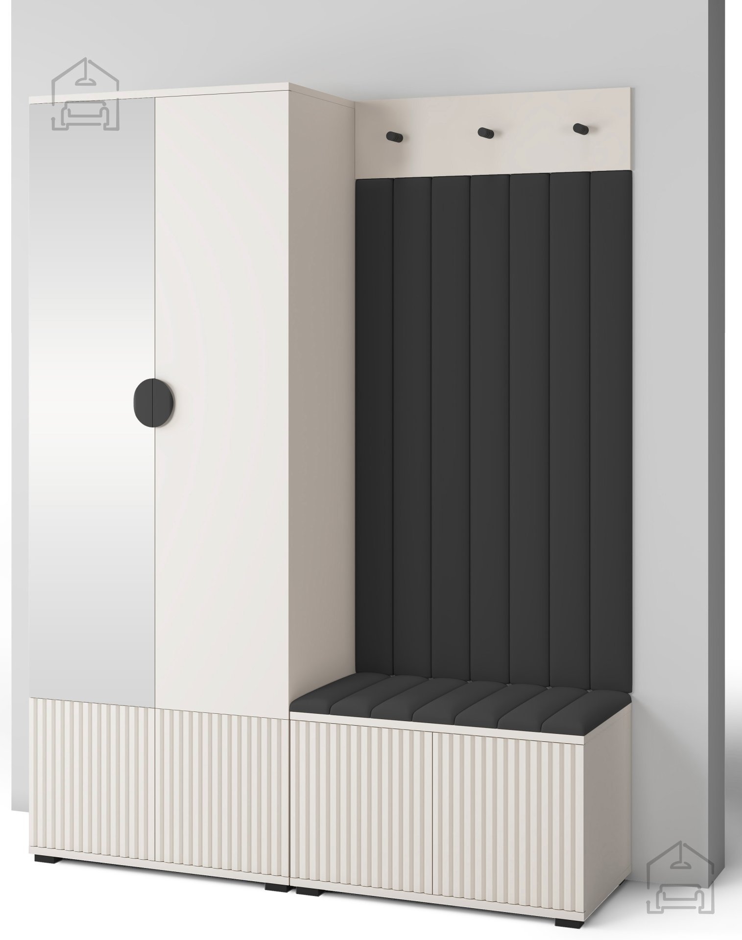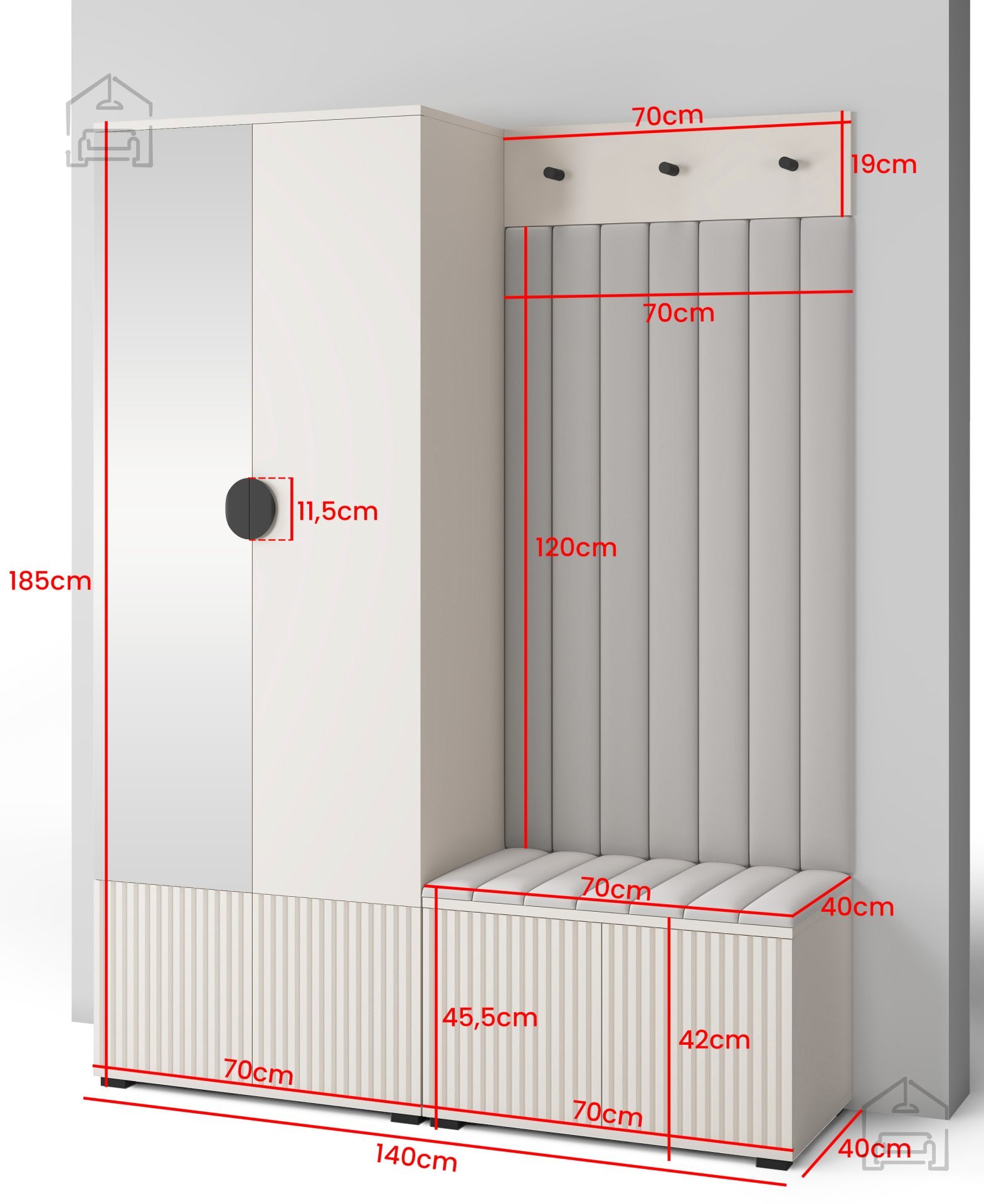 Das Set Rayo 1 besteht aus einer hochwertigen laminierten Platte mit 16 mm Stärke, die Langlebigkeit und eine lange Lebensdauer garantiert. Seine Farbe, Cashmere, bringt Wärme und Eleganz in Ihren Raum und lässt sich gleichzeitig leicht mit verschiedenen Einrichtungsstilen kombinieren. Kunststofffüße mit einer Höhe von 2 cm sorgen für Stabilität und Bodenschutz, sodass Ihr Flur immer ordentlich aussieht.