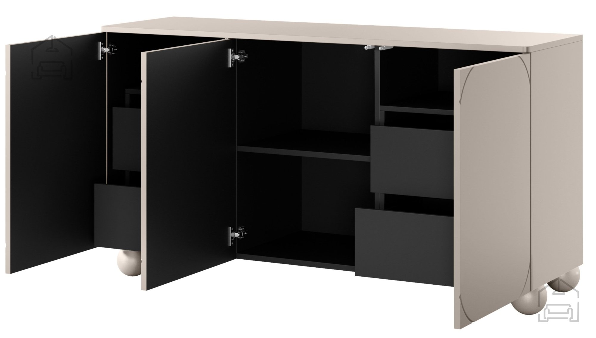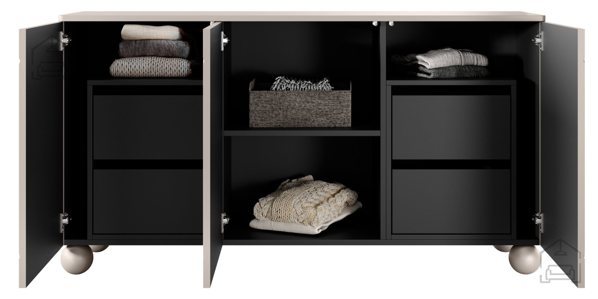 Einer der Hauptvorteile dieser Kommode ist ihre Funktionalität. Mit drei Türen und vier Schubladen bietet sie reichlich Stauraum, was die Organisation Ihrer persönlichen Gegenstände und die Ordnung Ihres Raumes ermöglicht. Das sanfte Schließen und das Drücken zum Öffnen sorgen für eine leise und einfache Nutzung, was ideal für Familien und alle ist, die Ruhe in ihrem Zuhause schätzen.