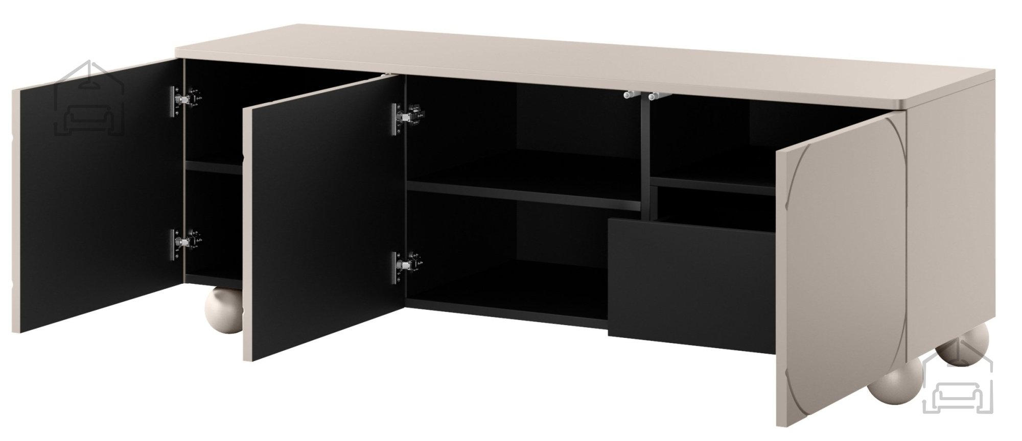 Der beeindruckende Kaschmirfarbton in Kombination mit schwarzen Elementen und runden Holzbeinen mit einer Höhe von 12 cm verleiht Ihrem Zuhause einen Hauch von Eleganz und Modernität. Diese TV-Kommode ist nicht nur schön anzusehen, sondern auch äußerst funktional. Sie ist mit drei Türen und einer Schublade ausgestattet, die sich auf Druck öffnen und sanft schließen, was eine leise und komfortable Nutzung gewährleistet.
