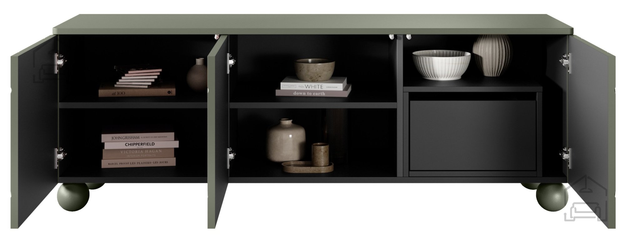 Sonatia II besteht aus einer hochwertigen Möbelplatte mit einer Stärke von 18 mm, die außergewöhnliche Haltbarkeit und eine lange Lebensdauer gewährleistet. Die Oberfläche ist mit einer supermatten PVC-Folie beschichtet, die kratzfest ist und eine einfache Reinigung ermöglicht. Schwarze Elemente, einschließlich Boden und Regale, verleihen einen Hauch von Eleganz, während die olivgrüne Farbe Frische und ein natürliches Aussehen in Ihren Raum bringt.